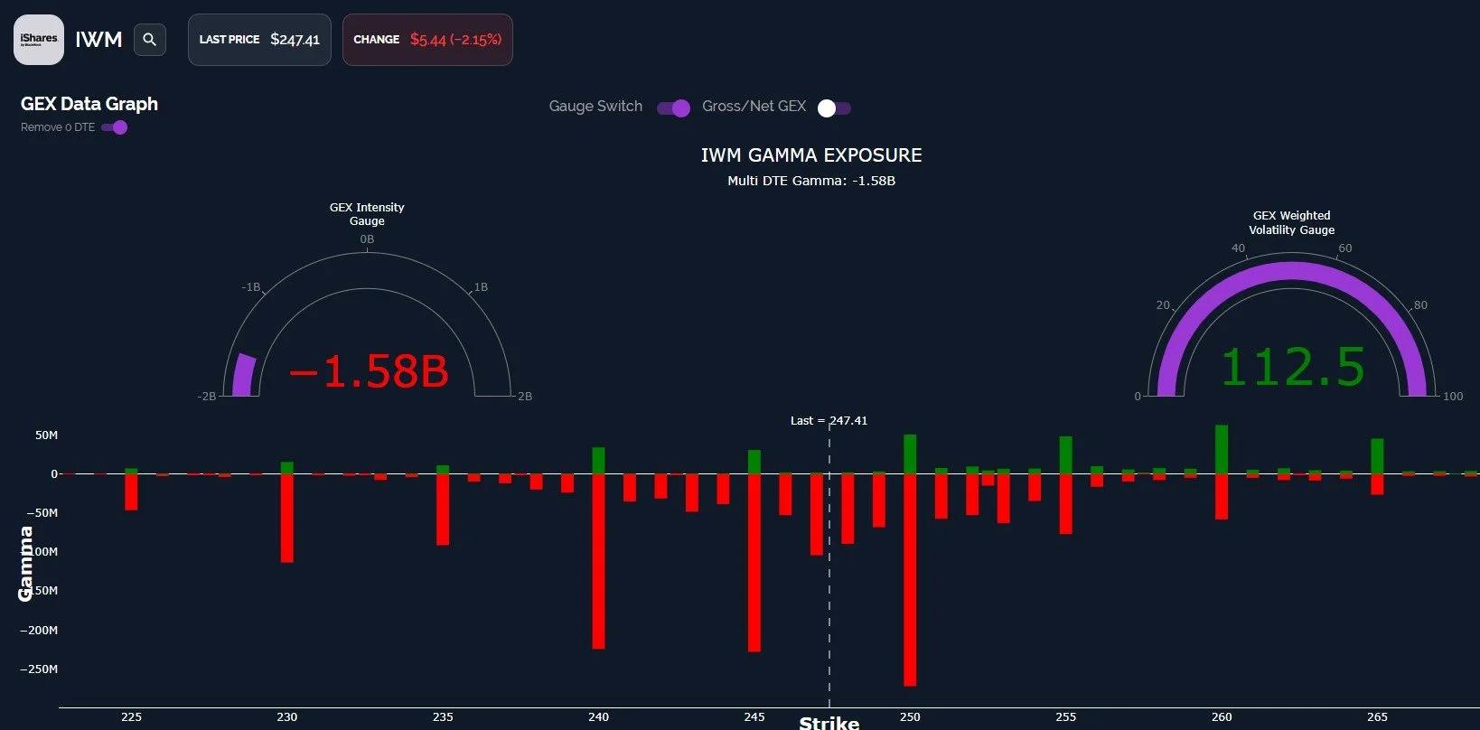 To look at IWM from a different perspective- the data graph shows the same GEX picture as shown on the chart above, but we also have the GEX Intensity Gauge and the GEX Weighted Volatility Gauge shown for additional context.