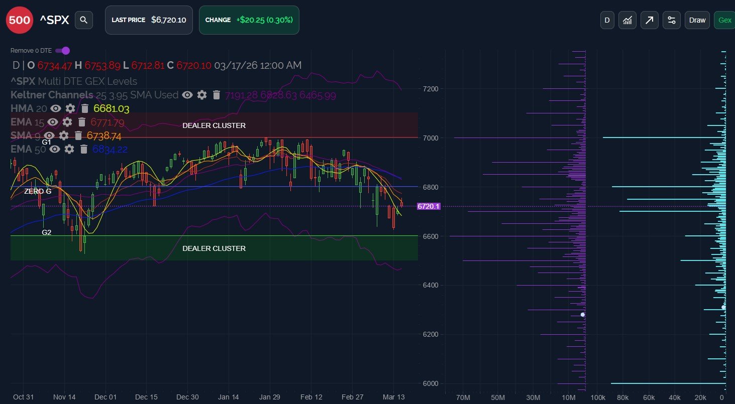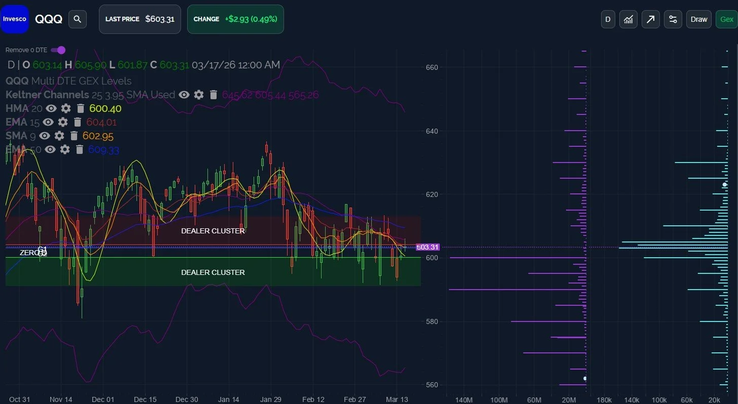 QQQ 600 has been an important area going back to early February, and mid-March has brought 590 into focus, with multiple tests of 591+ occurring. Will we break below 590, or have we seen sufficient tests of 590-600 to consider the decline “over?” The lower Keltner channel is closer to 565, though GEX drops off significantly below 580, so we are left with uncertainty heading into tomorrow.