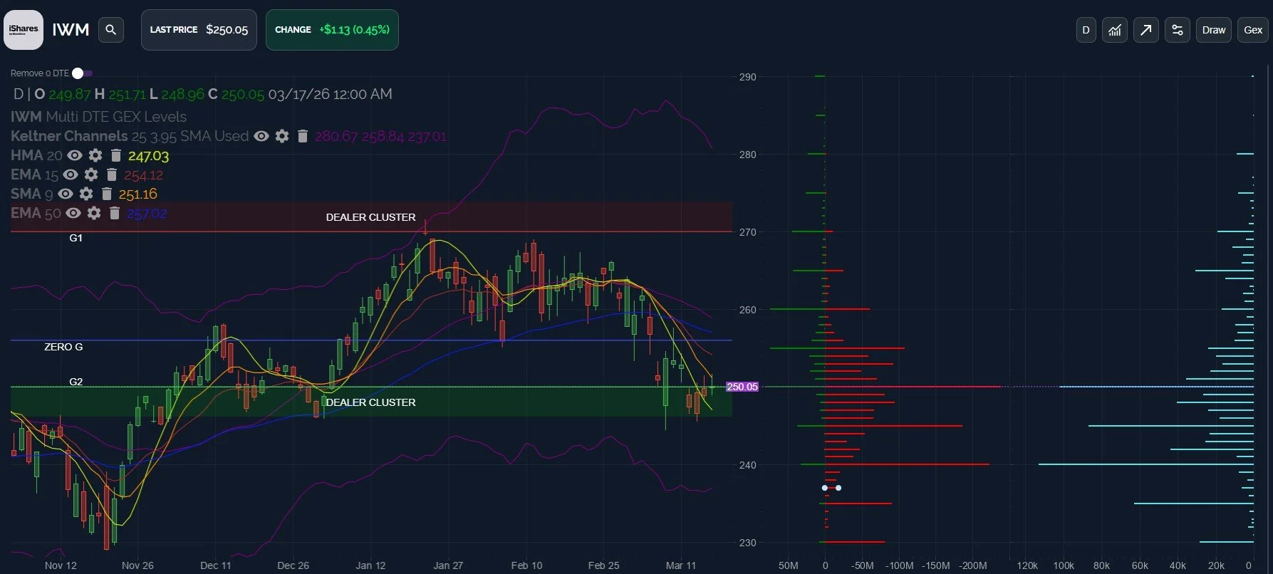 IWM closed above the declining HMA, but failed to get past the 9 SMA, so the picture hasn’t dramatically changed just yet. We still see GEX at lower strikes as well as daily volume, so we’ll watch for the risk of more selling below 247, or a better look for bulls if IWM can close above 254.