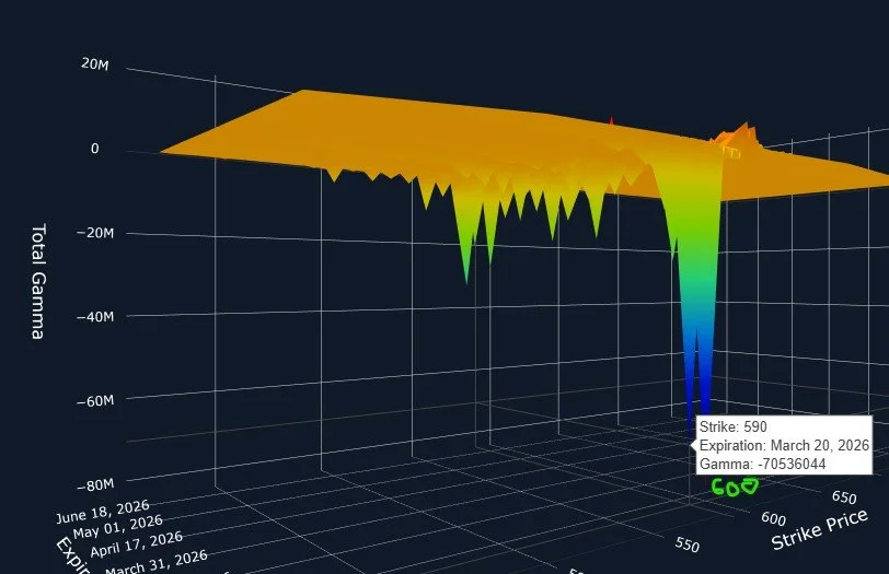 Today’s 3D graph is looking very similar to yesterday: Very large GEX clusters at 590 and 600 expiring Friday. GEX seems to imply that we still have a decent chance of seeing lower prices, even if temporarily.