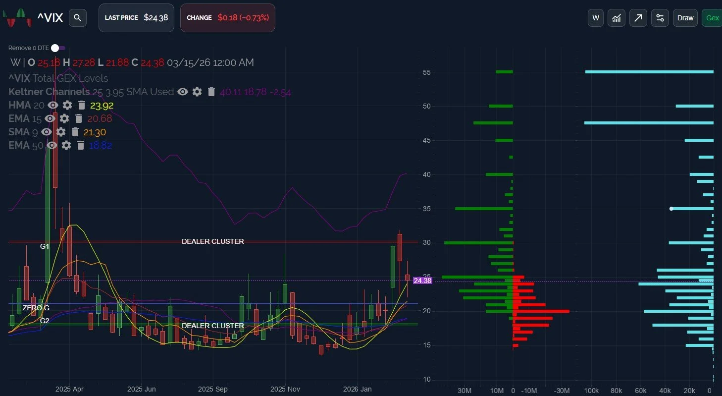 Retests of the line have been holding so far, and the GEX picture combined with today’s volume still looks bullish for volatility. The picture of higher lows will be threatened if the VIX can close below the 21 area, but until then, we’ll be cautious of the underlying trend lower for indices.