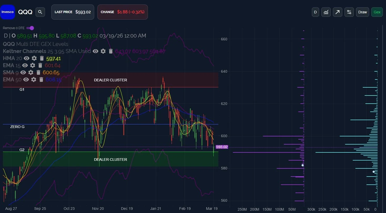 Bulls may want to see the HMA at 597 and then the 9 SMA at 600 recaptured on a daily close to paint a more neutral picture for QQQ, otherwise, the weekly 50 EMA (not on the daily chart shown) is at 578 and we have the lower Keltner around 565, so both of those strikes may be worth watching in the event of continued selling.