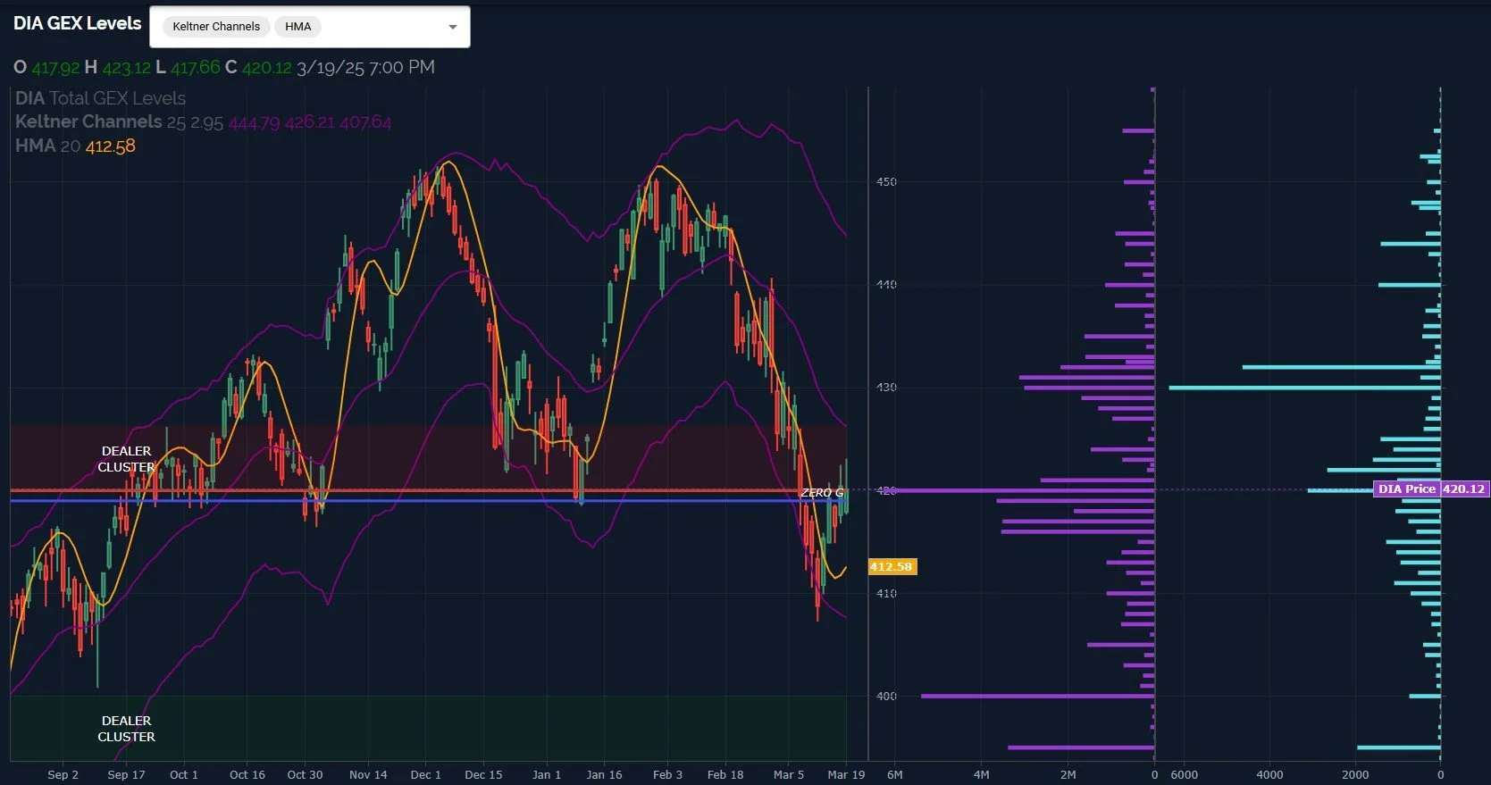 Same story for DIA, except that DIA’s total GEX has been the most positive of major indices, flirting with positive GEX instead of being deeply negative. While we do need to keep an eye on the 400 GEX cluster, an area not visited since September, we see both GEX and volume at 430 and higher that could potentially be reached quickly with any upside move, given the lack of meaningful GEX between 420 and 430. In other words, a move to 430 wouldn’t take much if the bias of the day is toward upside. 412 is where I think bulls need to make a stand if we end up lower Friday.