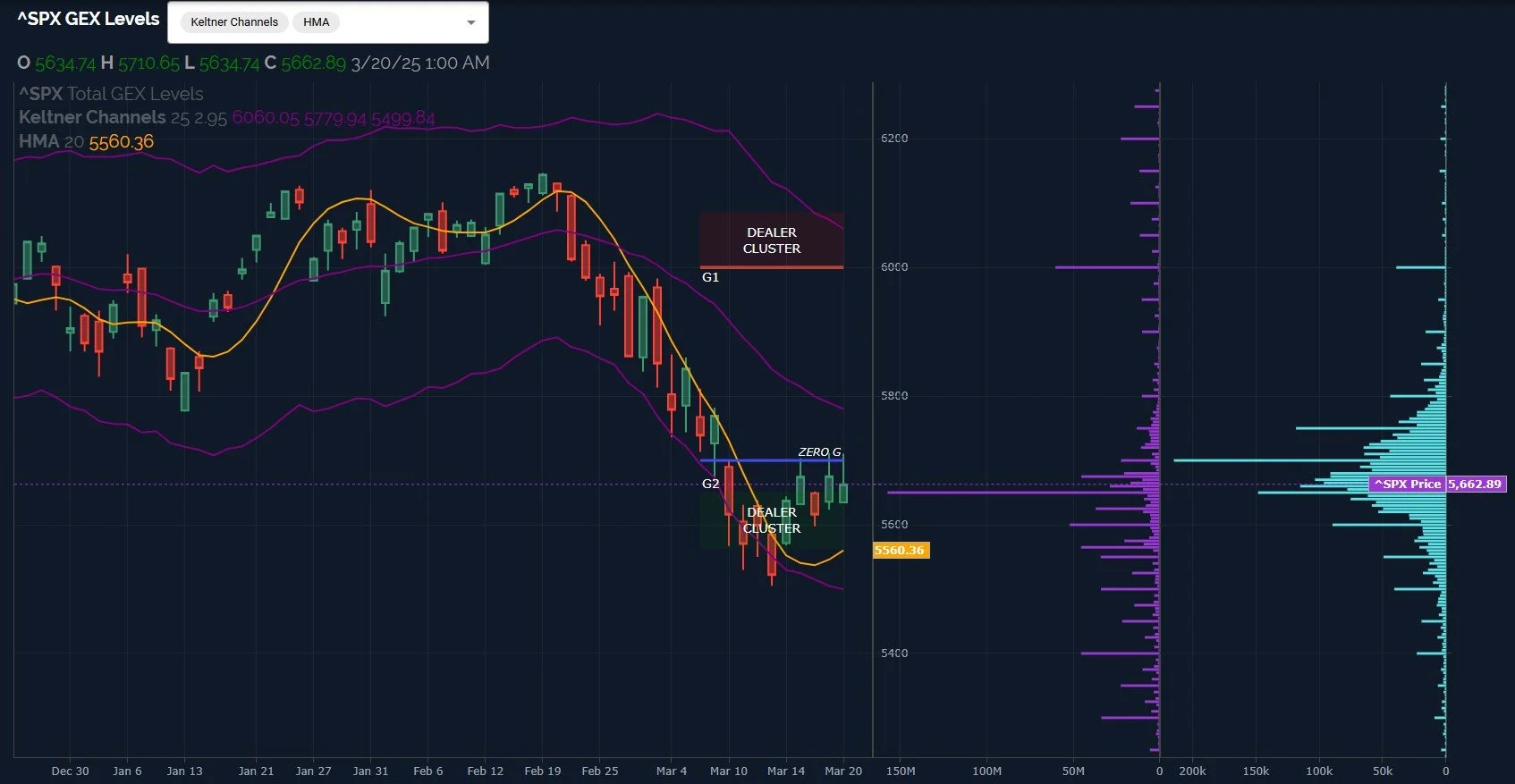Referencing the VIX chart above, we’ll focus on the highlights: The option market has shifted, reflecting lower strikes than we saw earlier in the week for both Dealer Cluster zones. This is likely a mark in favor of market bulls in the short term. The VIX is also below the Hull moving average, the largest GEX clusters are between 16-20, and the smaller 2-hour and 4-hour timeframes also look bearish for volatility. In terms of the Hull, market bulls will want to see the 22.57 retest rejected as a sign that the VIX is truly done. I say retest because it would be very normal to see some sort of VIX bounce, perhaps Monday if not Friday.