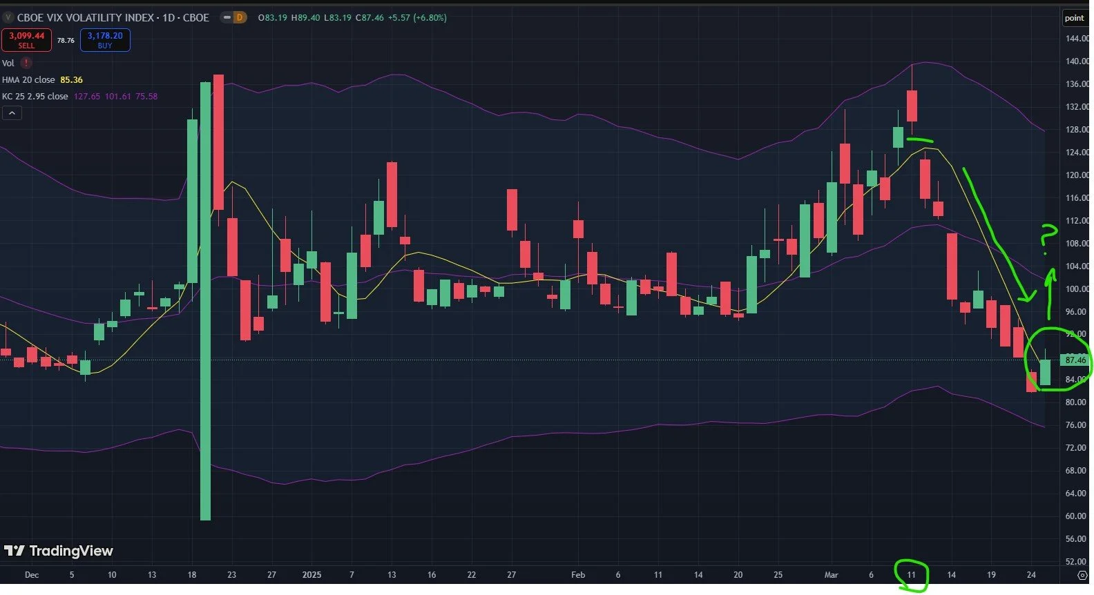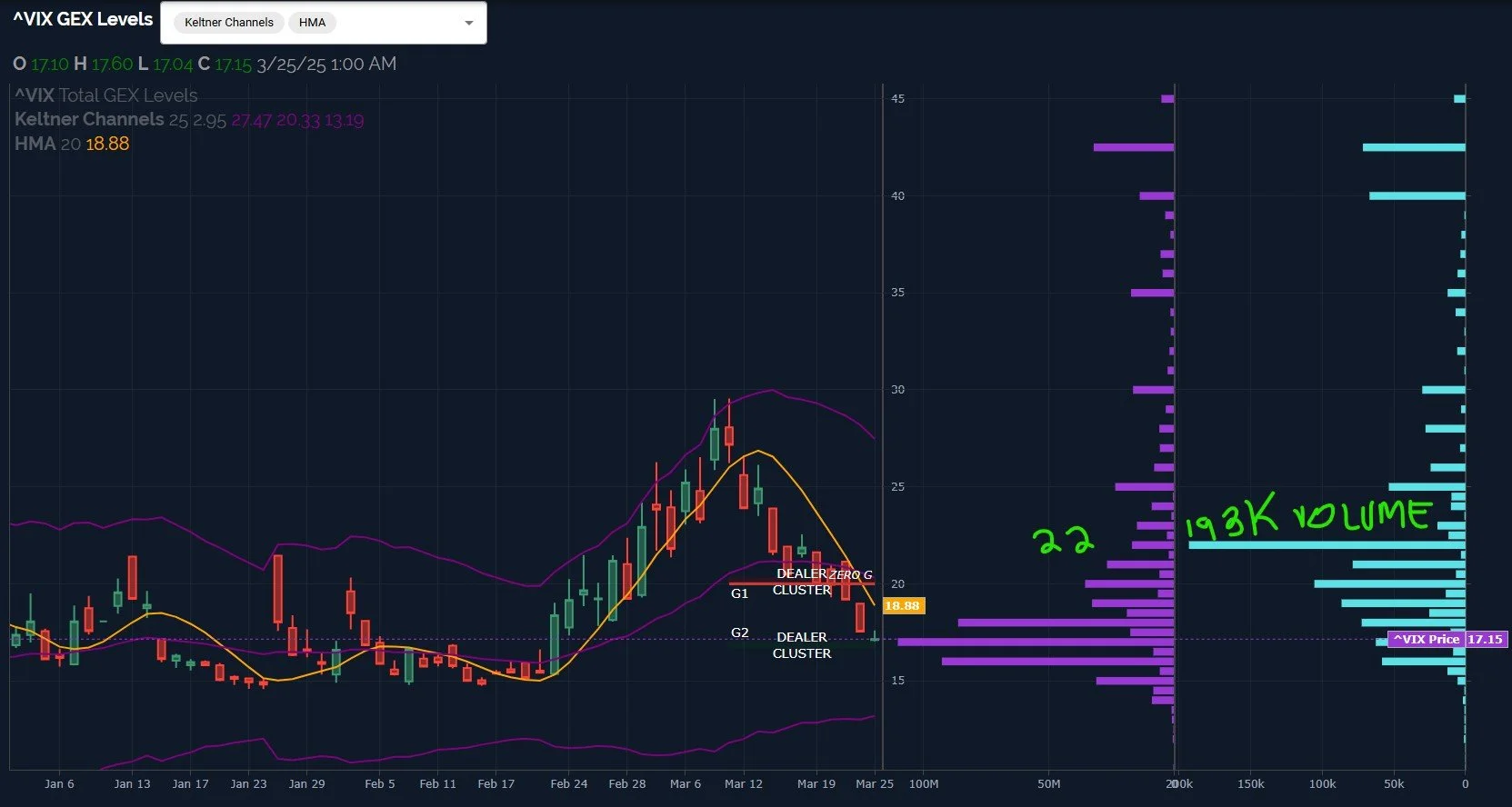 IWM was even worse, gapping down today, though closing higher than the cash session opening price. But even the closing price today was lower than yesterday’s close, so IWM is lower, right at the rapidly rising Hull. A loss of 203 on a daily close and tactically I’ll flip bearish on IWM. A subtle yet potentially important shift today- the GEX at 215 that I’ve mentioned and watched over the last week is gone. You can see the volume in light blue, but the GEX is almost nothing. 199 and 198 saw elevated volume today compared to every strike except those between 206-210, why? I also don’t like the lower Keltner continuing to dive even lower with each passing day. This (sadly for bulls) makes sense if the SPX 5565 cluster on 3/31 is live and a high probability target. We still have enough time to see the picture shift, or for divergences to expand for a few days while the market stays “propped up,” so don’t take my questions and points as a guarantee that we immediately drop.
