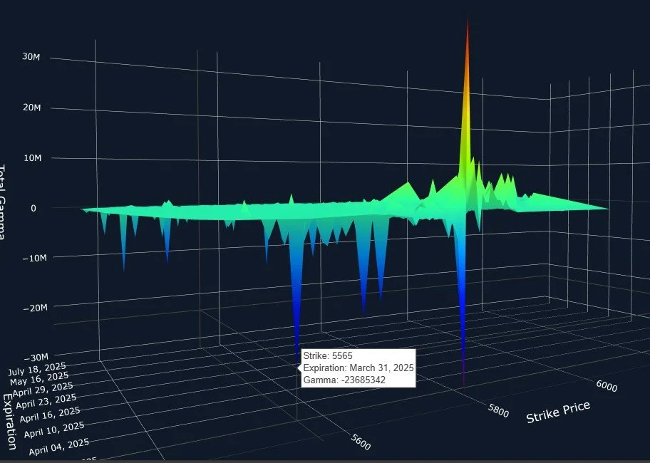 I am also drawn to a consistent data point that has lingered for a few days: Besides the 0 DTE clusters that expired today, the largest cluster for 3/31 is at 5565, a negative GEX cluster. Why hasn’t that cluster disappeared if we’re going to 6000? I don’t see a corresponding positive cluster that might tell us we’re dealing with a hedge situation, though that’s not the only explanation.