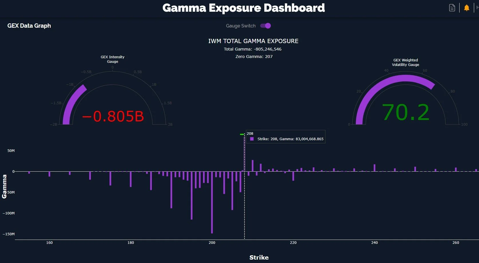 Another way of showing IWM’s current position- we have negative GEX, well off of the extremes, and 208 is now the largest positive cluster. Bears remain stubborn at lower strikes, especially down to 190.
