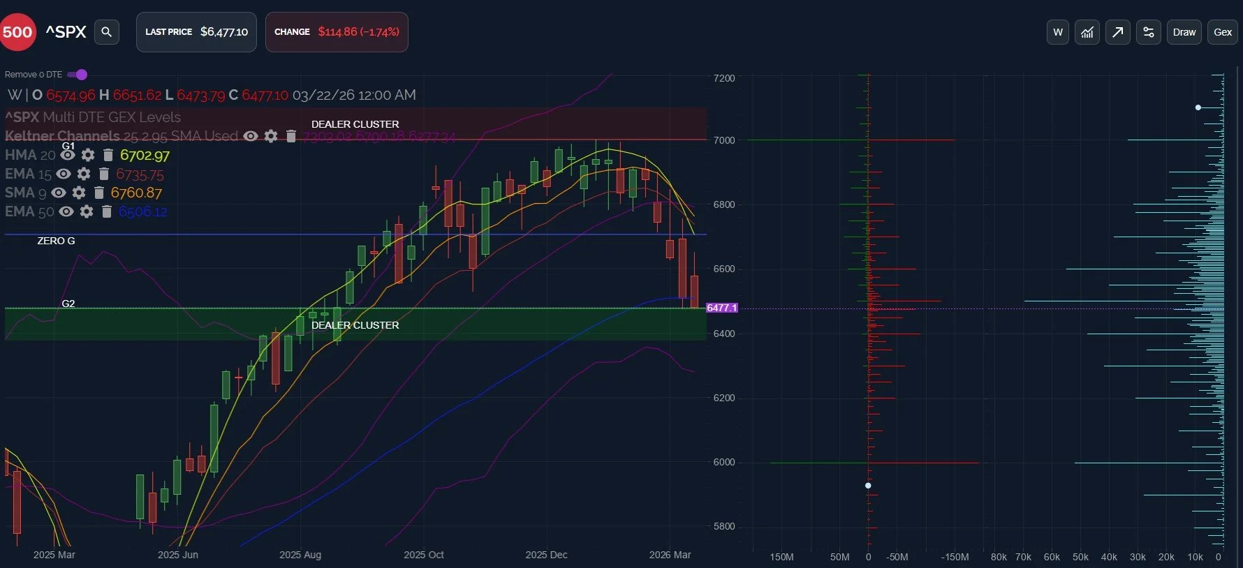 If SPX overshoots the lower Keltner channel on the daily chart- currently at 6454- we might see a fast knife drop to the lower weekly Keltner at 6277. This line is within 23 points of what I consider to be the last large net GEX cluster at 6300, giving us some confluence to watch.
