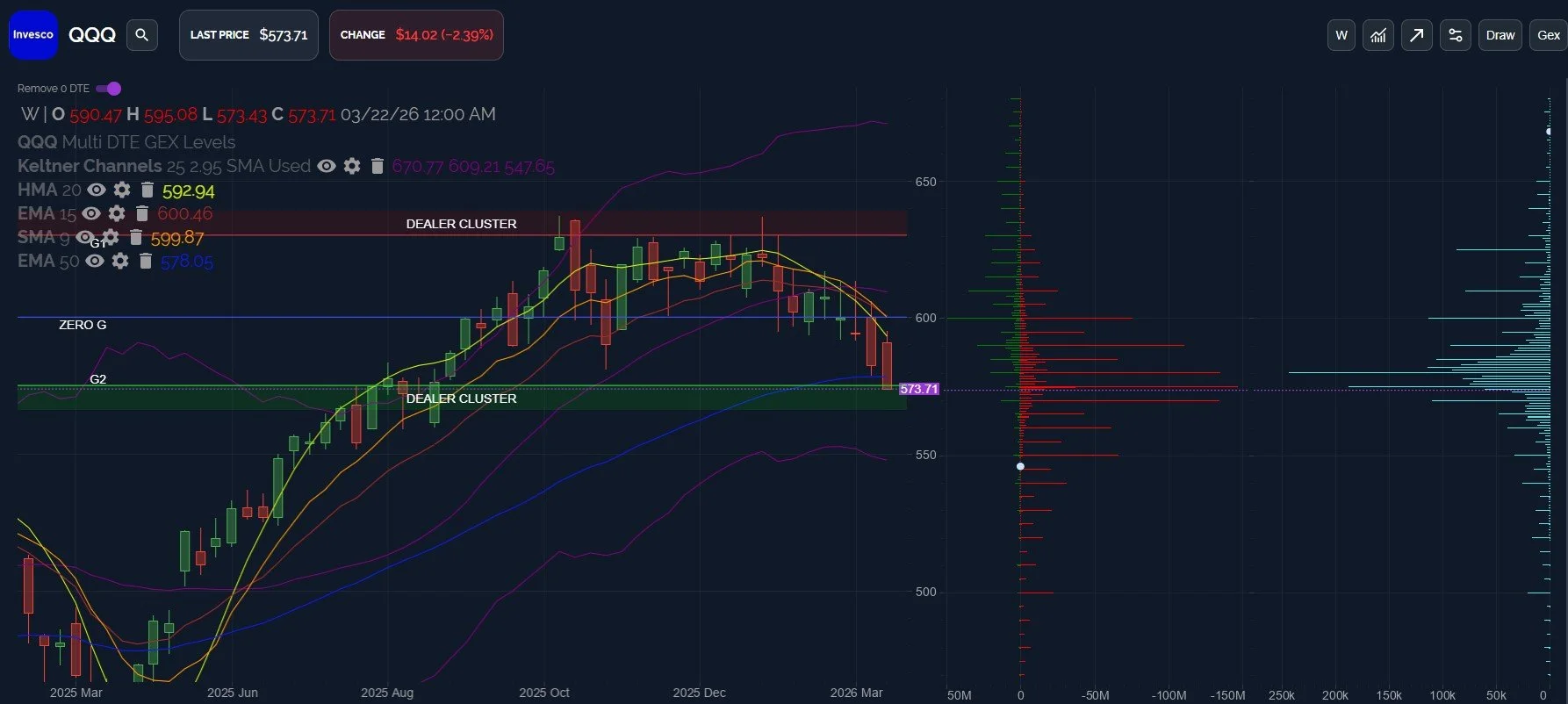 QQQ’s weekly picture shows 550 as an interesting spot to watch if we lose 570 on a daily close, with 550 matching the lower weekly Keltner channel as well.