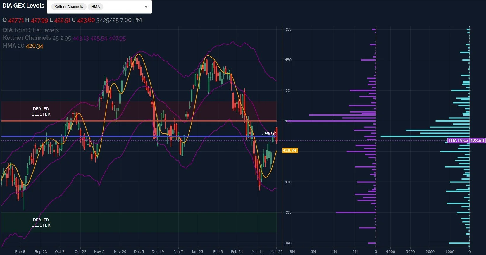 Alright, let’s not all go to bed wondering why we didn’t accumulate more hard assets like Bic lighters and bullets (or bullion?), let’s end with something positive for bulls. At least DIA is still looking like the strongest game in town, not quite declining to the rapidly rising Hull, and the lower Keltner channel has turned up. I still see 430+ as a solid target that hasn’t been reached, with large GEX clusters present. The angle and trajectory of the Hull itself means staying above it will require immediate reaction from price, but at least we will have the answer as to where we go next relatively quickly. Join us in Discord and we’ll do our best to share any clues presented by 0 DTE GEX.