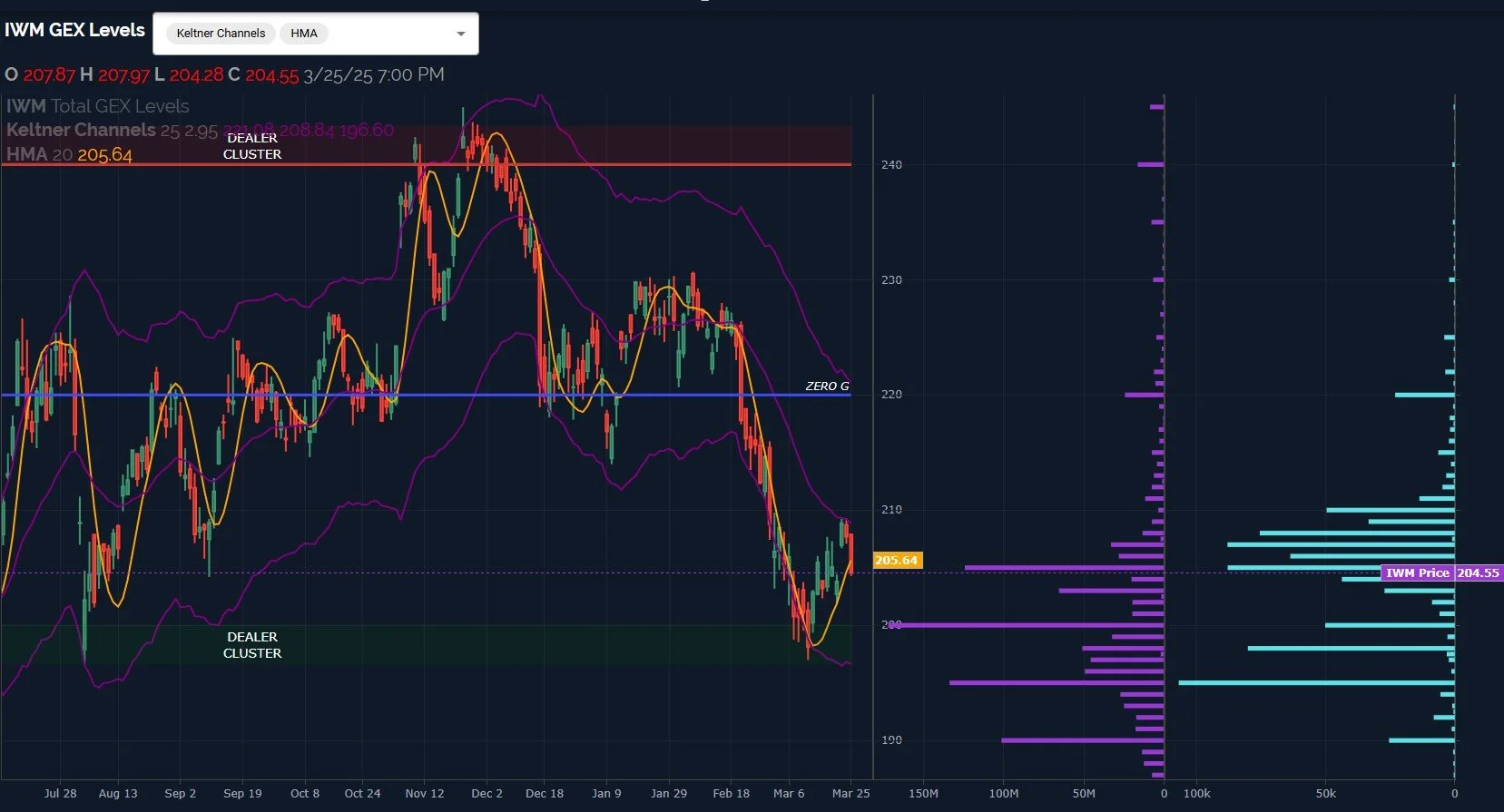 I wish I had better news for IWM, but I don’t. The mysterious disappearance of GEX at 215 may not be so mysterious, but it still remains, with virtually no positive GEX visible except a few tiny clusters spread out up to 220 and beyond. Volume was noteworthy at lower strikes, especially 195, and IWM closed below the Hull, a bearish signal. Perhaps the best news for IWM is that the lower Keltner has slightly turned, lessening the trajectory to the downside for the Keltners, and the GEX clusters look a bit extreme, maybe too one-sided toward the negative.