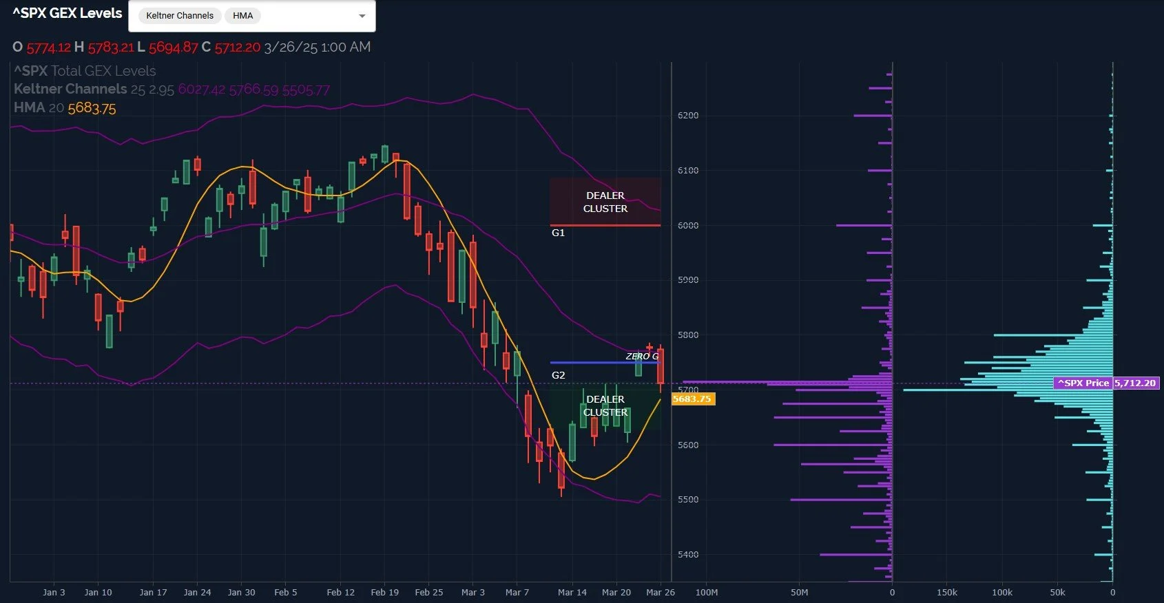 Looking at SPX below, in one day we saw a big shift back in the negative direction, with a lot of GEX disappearing from higher strikes while 5500-5700 saw more interest and sizable GEX clusters either remaining or increasing Technically, we see SPX almost touching the Hull, and holding it for now, so we have a conflicting long signal for the VIX yet also a long signal for SPX. With the Hull below the SPX currently sitting at 5684, at least we have a fairly tight “stop” to watch to potentially reduce longs for those tactically watching the Hull as an indicator.
