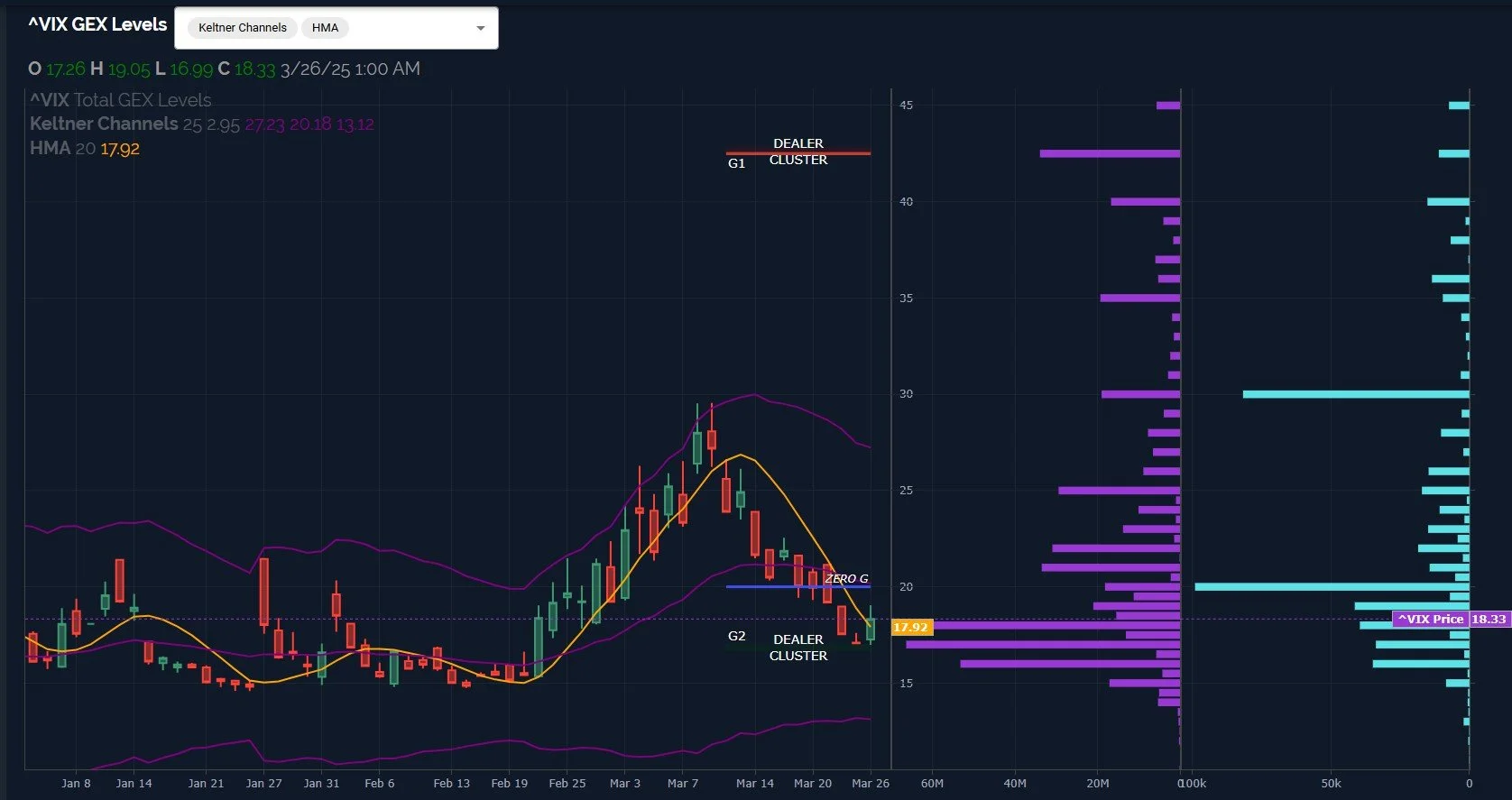 The VIX bounced nicely off of the big lower dealer cluster at 17, as seen on the chart above, achieving a daily close above the Hull moving average, something that hasn’t happened since March 11. Closing above the Hull is a long signal according to my methodology, which might not be great for market bulls. To caution that the inverse of what we saw when the market was declining (occasional closes right at the line that failed the following day) might happen, an immediate market rally tomorrow will likely invalidate this signal. But notice the elevated volume at VIX 20 and VIX 30. We noted elevated volume yesterday, as well, and we have virtually nothing but higher VIX GEX above 15. So downside is likely limited for the VIX, while upside is potentially expansive, in the very big picture.