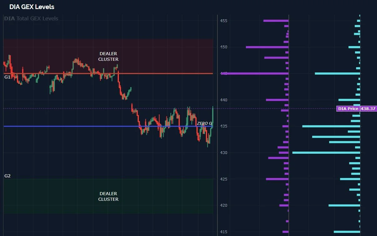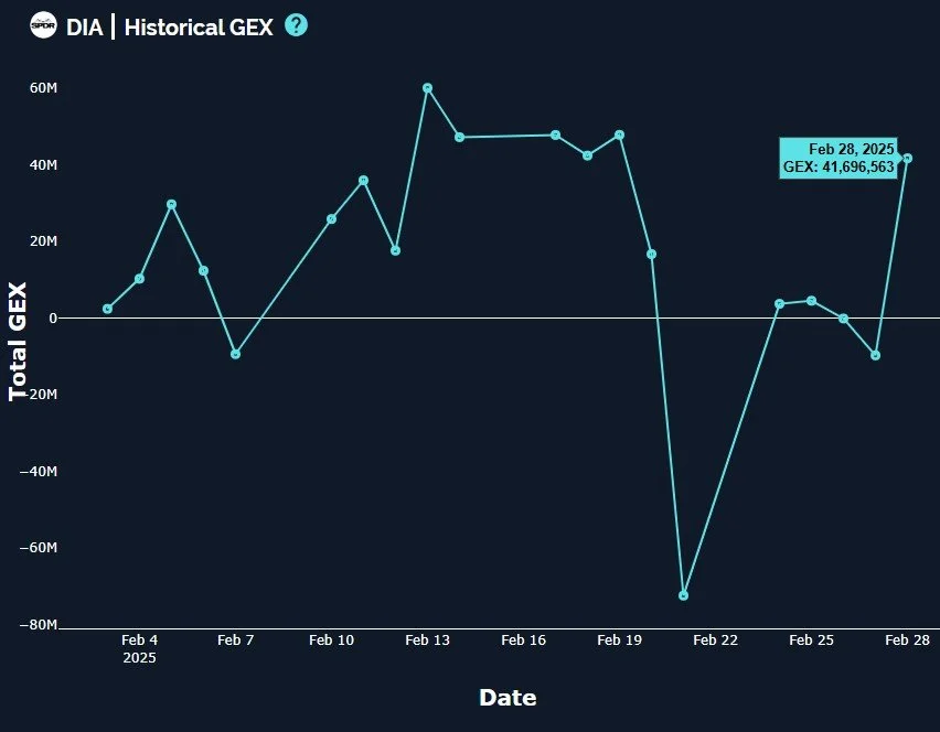 DIA almost tagged 430 on Friday before rebounding, and we see a lot of volume (the light blue bars) between 430-435. Notice the outlier volume and the large GEX cluster at 445? Most of that is clustered around the March 21 expiration. I see 445 as a live target by that date.