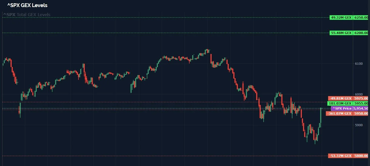 I included our GEX Clusters setting (a toggle on our GEX Levels chart) to show the largest GEX clusters, both positive and negative. You can see that 5975 is an important negative cluster, merely 7 points above the current reading for the Hull moving average. Perhaps that is next upside target that could be a short-term battleground. I would expect a large move up if we can hold above that zone, and failure may imply a move down toward 5800, at least barring any shifts in the top GEX cluster strike prices (which is why we watch intraday shifts in GEX too).