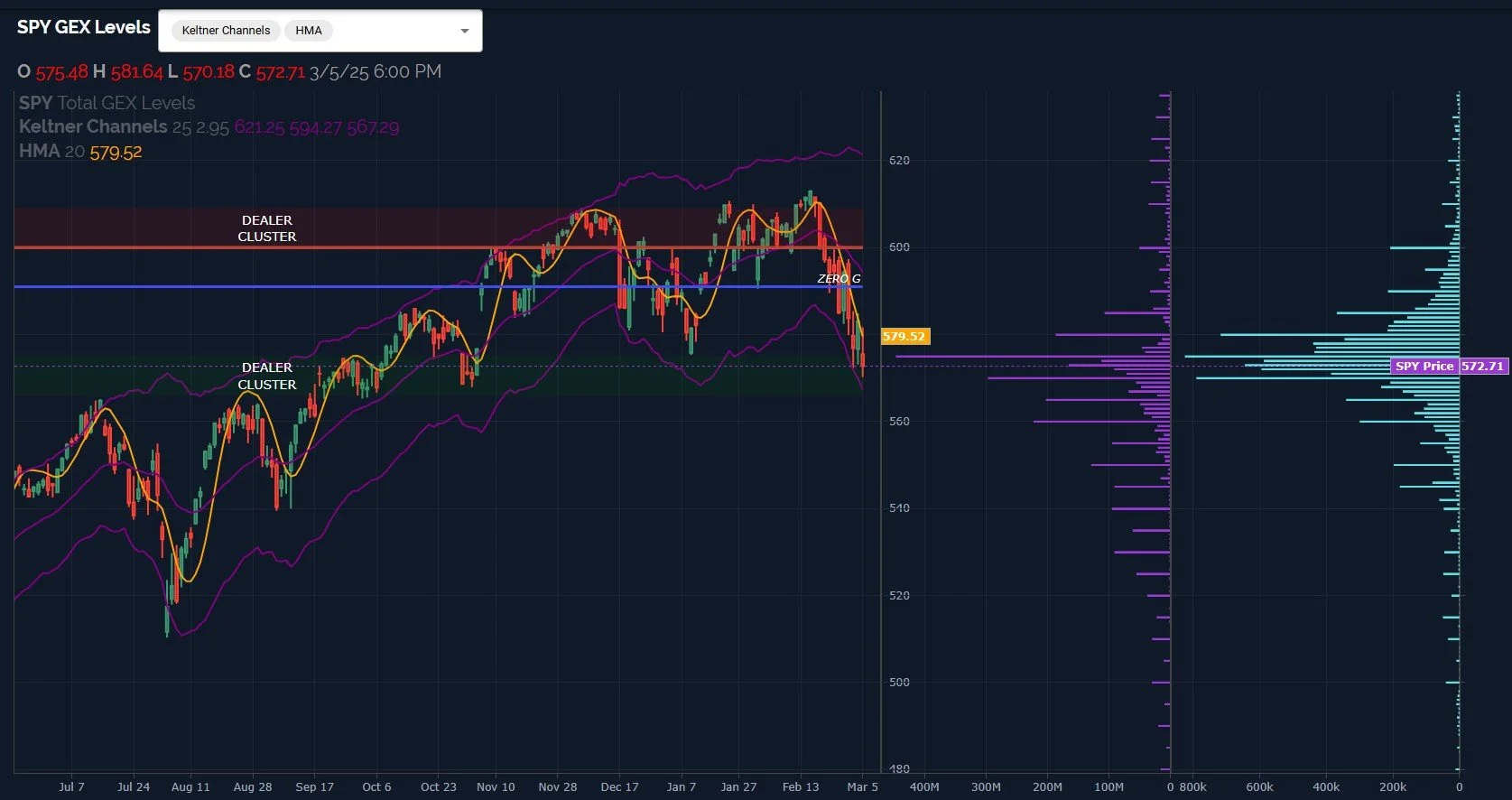 Currently, SPY and SPX rest at the lower Keltner channel, which can continue, though typically we expect a rebound from the lower channel, or potentially from a brief overshoot to the downside. Combine this with SPY being in the lower Dealer Cluster zone and we have a setup that may require some patience and waiting through volatility, but the odds favor higher when combining all of these factors.