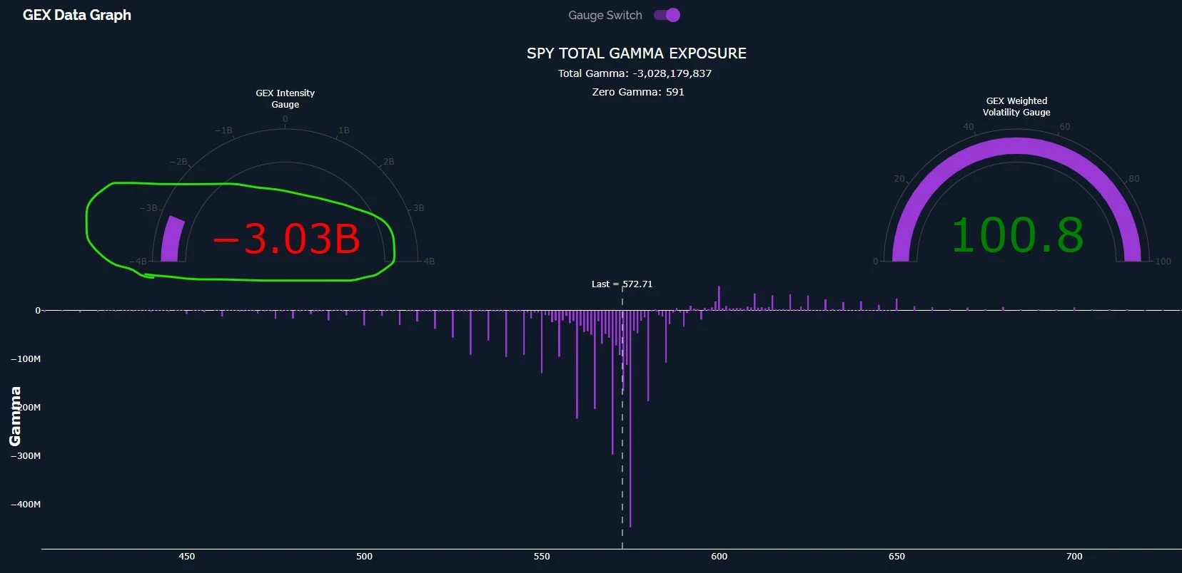 Looking at the gamma exposure (GEX) Graph above, we see an interesting development, namely that the GEX Intensity Gauge shows SPY to be awfully close to an extreme reading on the negative side when compared to SPY GEX over the last 52 weeks. SPY has been a good contrarian indicator at various times over the last 2 years when we see the GEX Intensity Gauge that extreme. Contrarian signals are typically not exact in their timing, and this is no exception, though I would expect to see something happen in the next few days. A few days (like the last couple of days this week) can feel like forever when the market is moving dramatically, so we exercise patience and scale risk appropriately to account for the above average movement intraday.