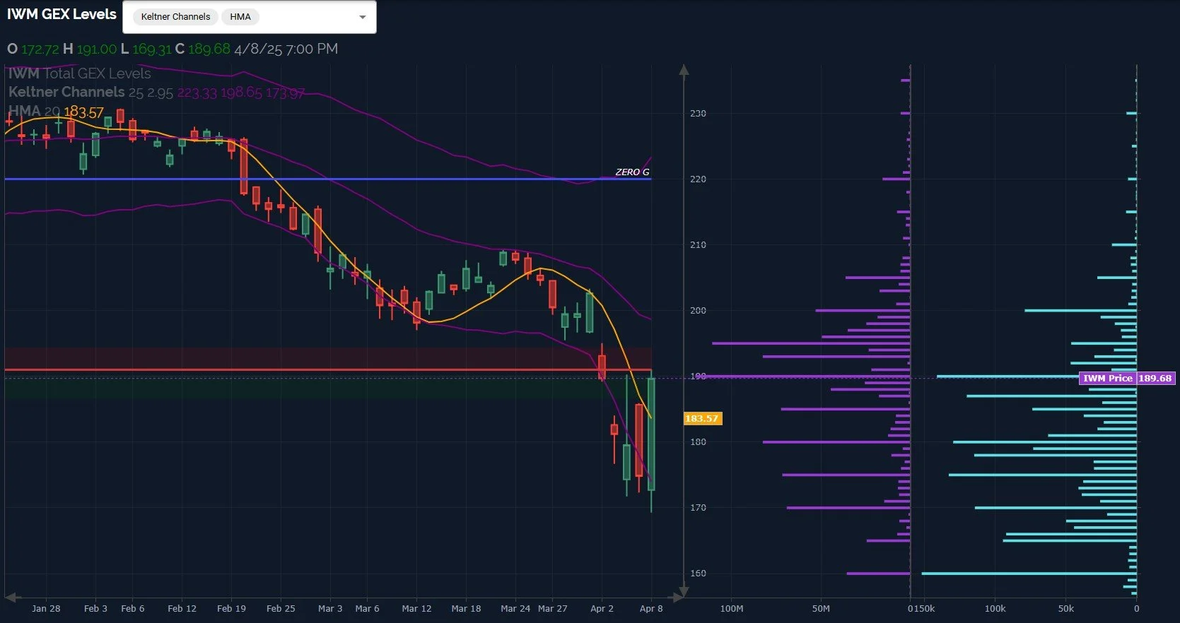 QQQ has already reached the middle Keltner channel, also coinciding with the zero GEX level and a large Dealer Cluster. Once again, it would not be surprising to see a retracement back to the Hull at 435, and holding the Hull will be key to preserving the bullish picture. Hopefully GEX will give us additional clues as well.
