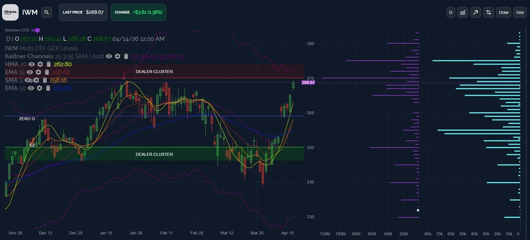 In the event of a pullback, 600 is of interest based on volume and the location of the 50 EMA, though QQQ can climb another 1-2% (based on Keltner channels+GEX levels) first.