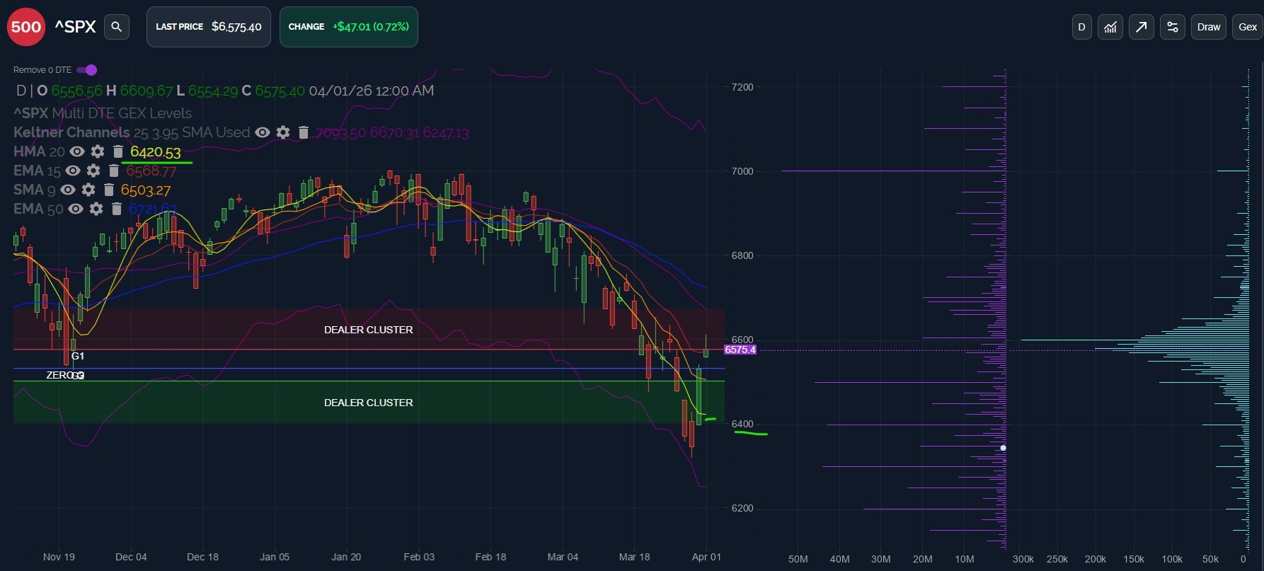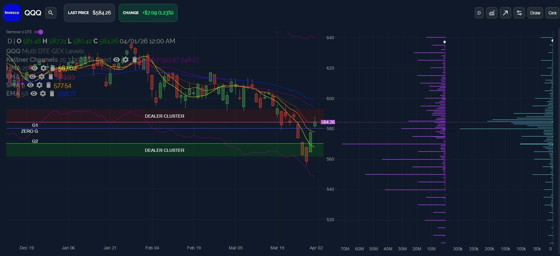 A tag of the lower channel matches quite well with the 550 area, though a more bullish scenario exists where QQQ reverses higher from the 560-570 lower Dealer Cluster zone, establishing a higher low.