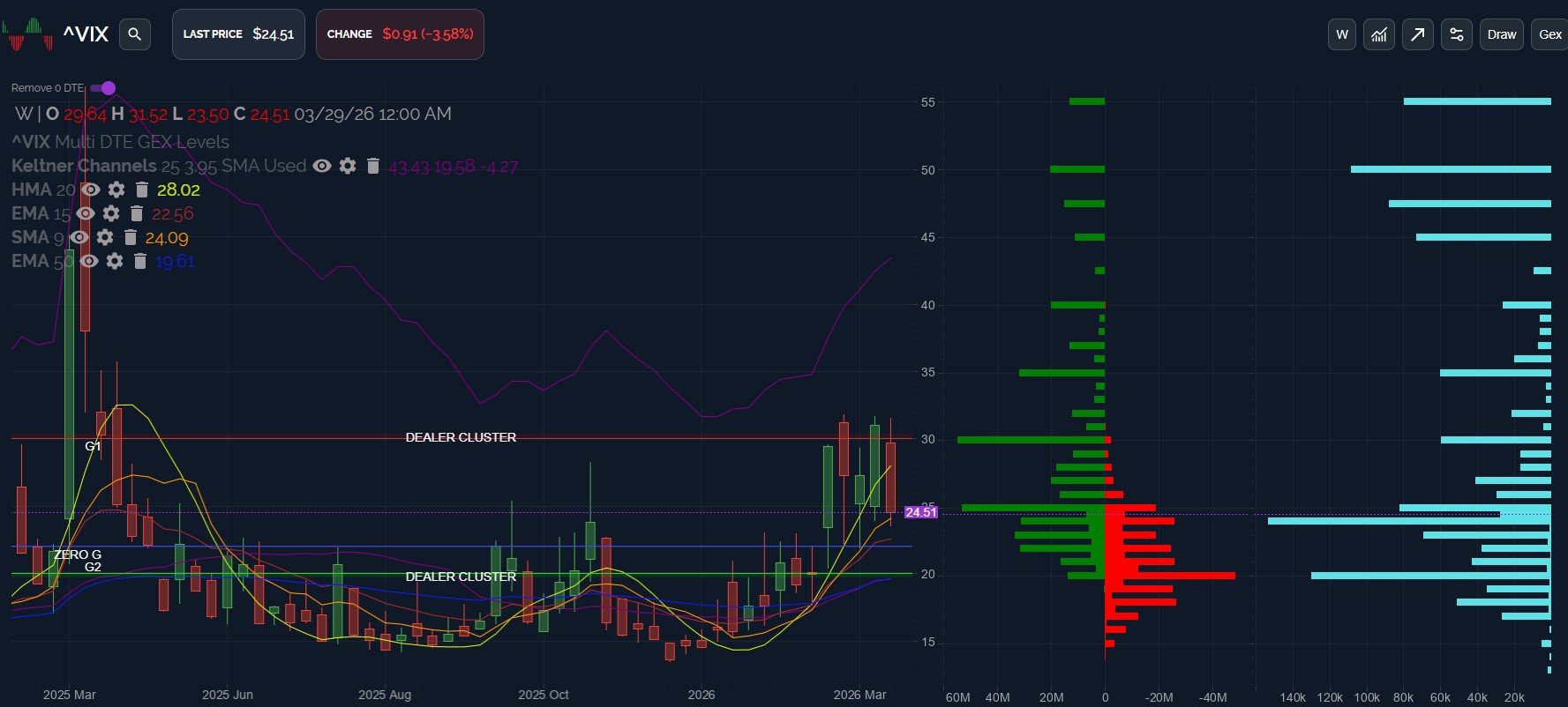 We have definitely seen a more negative shift in net GEX for the VIX recently, with 20 now showing meaningful negative GEX, so a bullish scenario might see the VIX reject from the 28-30 area and continue lower toward 20. Given the dive in futures, we may find out soon whether or not we will see another leg down for indices.