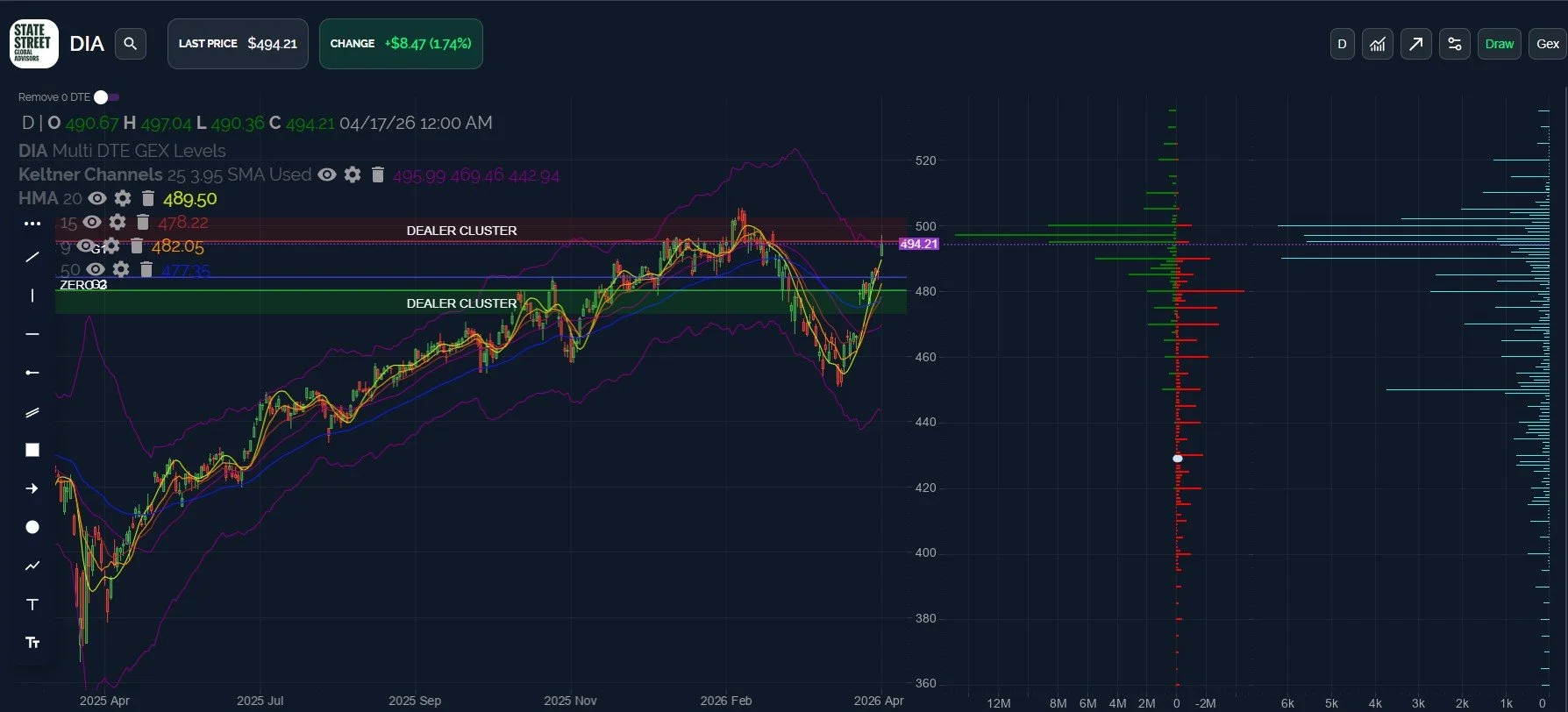 QQQ is in the upper Dealer Cluster zone and we see notable volume at the 600 strike, which I believe generally favors the odds of a pullback.