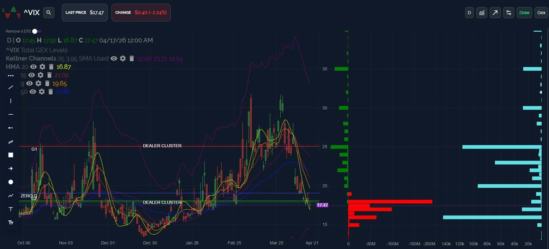 As of Friday, the VIX appears to need a push through the big negative GEX cluster at 18 to improve the odds of a spike toward 25, which I believe is possible based on GEX. Technically, 21-22 would be an initial first test of resistance, as mentioned in the YouTube video.