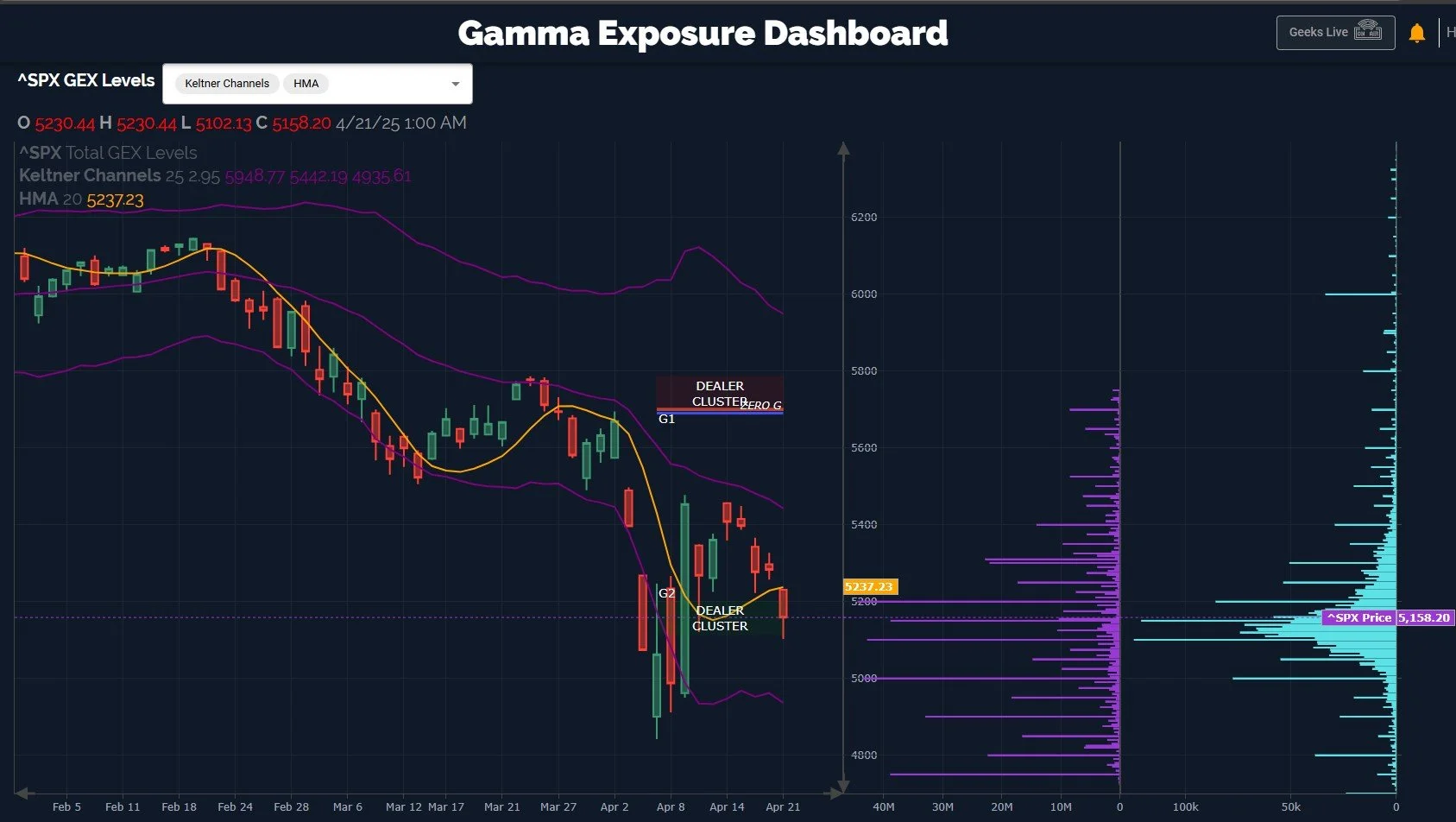 Starting with the GEX Levels chart for SPX above, today’s gap down below the Hull Moving Average (the yellow line) cements a downward bias already indicated by GEX, with 5000 appearing to be a likely target, and our old nemesis 4750 (jk, we love you 4750!) has popped up again with meaningful GEX. Given the proximity of the lower Keltner channel to the big GEX cluster at 5000, I’ll first watch for a potential secondary low in that area, which would actually be a higher low relative to the April 7 low.