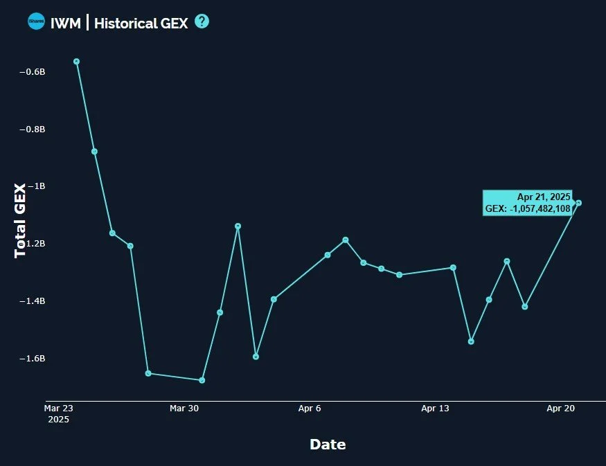 IWM’s Historical GEX graph below puts today’s divergent improvement in net GEX in context, still showing an overall solid negative bias, but I think this move in positioning lends credit toward a possible upside move before more downside.