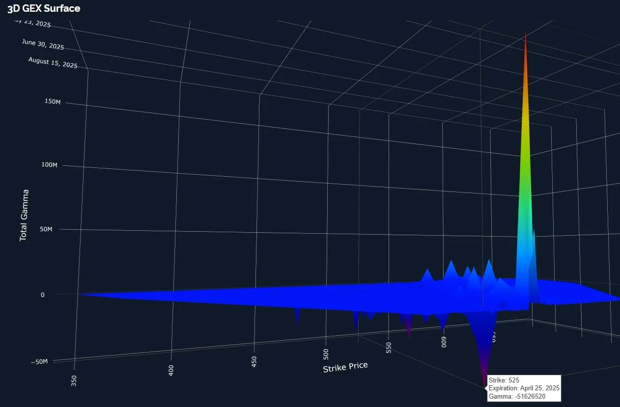 Lastly in terms of SPY, the 3D graph, which shows each GEX cluster instead of the net at each strike, shows 525 is the largest GEX cluster for Friday, so a closer look seems to tilt the odds toward the downside at some point before the week is over. Note that 525 also coincides with the Hull moving average on the daily chart, so I like the confluence. Holding above the Hull is bullish in my view from a short-term tactical perspective, but a drop to 525 is still 10 points lower, and we still need to consider other factors including the GEX outlook.