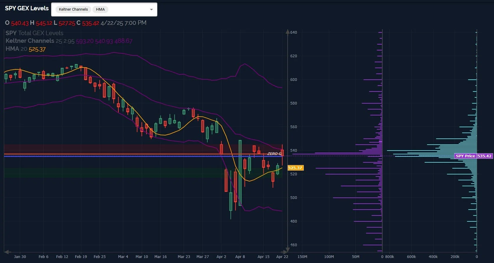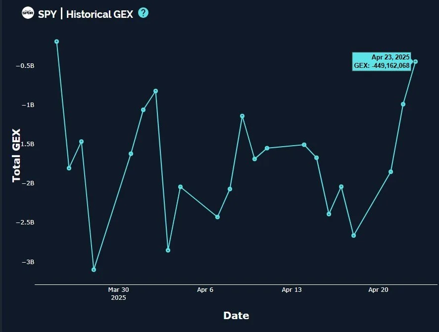Essentially the same story for QQQ, though we’ve seen an improvement in the GEX visible at higher strikes, including 480 and 500. Comparatively, those positive clusters are still not as large as the clusters at 420 and 430. We also still see the purple Keltner channels on the chart pointing lower and to the right, though not at as steep of an angle as we saw early April.