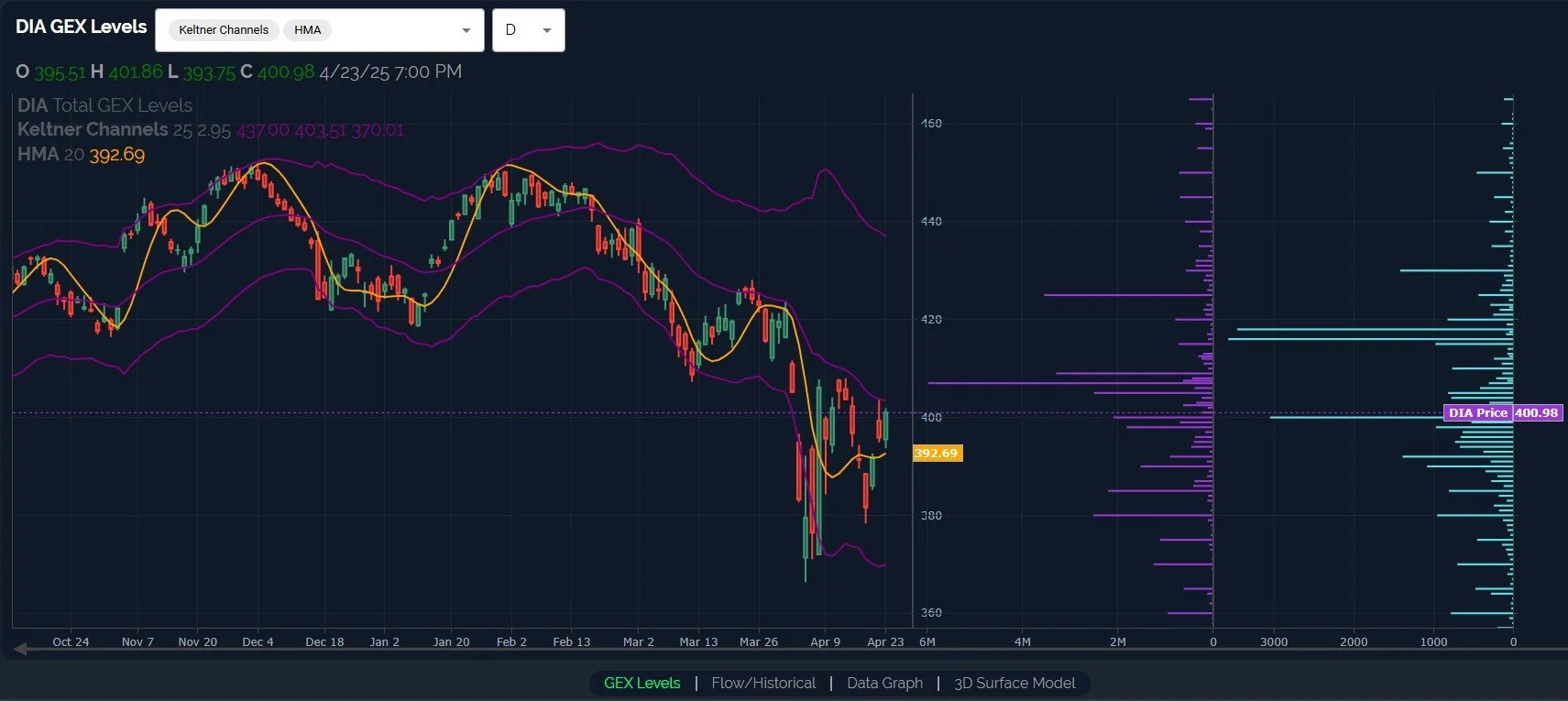 DIA appears to be last major index to have not closed above the middle Keltner channel. Could this group of crotchety-old grandpa stocks be the last checkmark necessary for the market to turn back south again, or is DIA simply limping along at the rear? The limping possibility seems unlikely, given that DIA led the way up and down several times over the last 6-12 months, which we highlighted along the way. I think there’s a real possibility DIA makes it above the middle Keltner tomorrow, perhaps touches the big 407 GEX cluster, and then the market begins its pullback. No need to flip a coin, we can wait to initiate intraday positions also using the GEX data shown on the 0 DTE (or weekly expirations on Friday) basis to improve our odds of success.