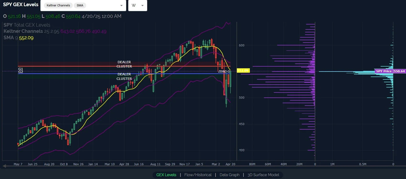 Let’s take a look at SPY above, for starters. The lower weekly Keltner is still pointing lower, though the upper Keltner has started pointing higher, though at a much more subtle angle. This may imply continued outsized volatility in both directions, though we are almost to the middle channel, so we’re immediately more concerned with the next move above or below the line. Note that we now have meaningful GEX at 600, so the range of notable GEX clusters is 500-600 currently.