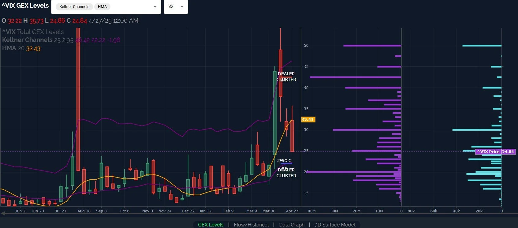 The VIX weekly chart gives us some interesting observations. For the full week, you can see we entered the week after closing below the Hull the previous Friday, attempting to rally above the Hull again, but seeing rejection and a close deeply below the weekly Hull. We saw a negative shift for volatility last week that corresponded with the markets improving, with positive GEX reducing and GEX at the 20 strike growing significantly. This may be the “ultimate” destination for the VIX as the market reaches one of the levels discussed above, in theory. But note the large GEX clusters still at 42.5 and 50? This is unusual relative to recent history and represents another red flag regarding the most recent market decline being a run-of-the-mill pullback.