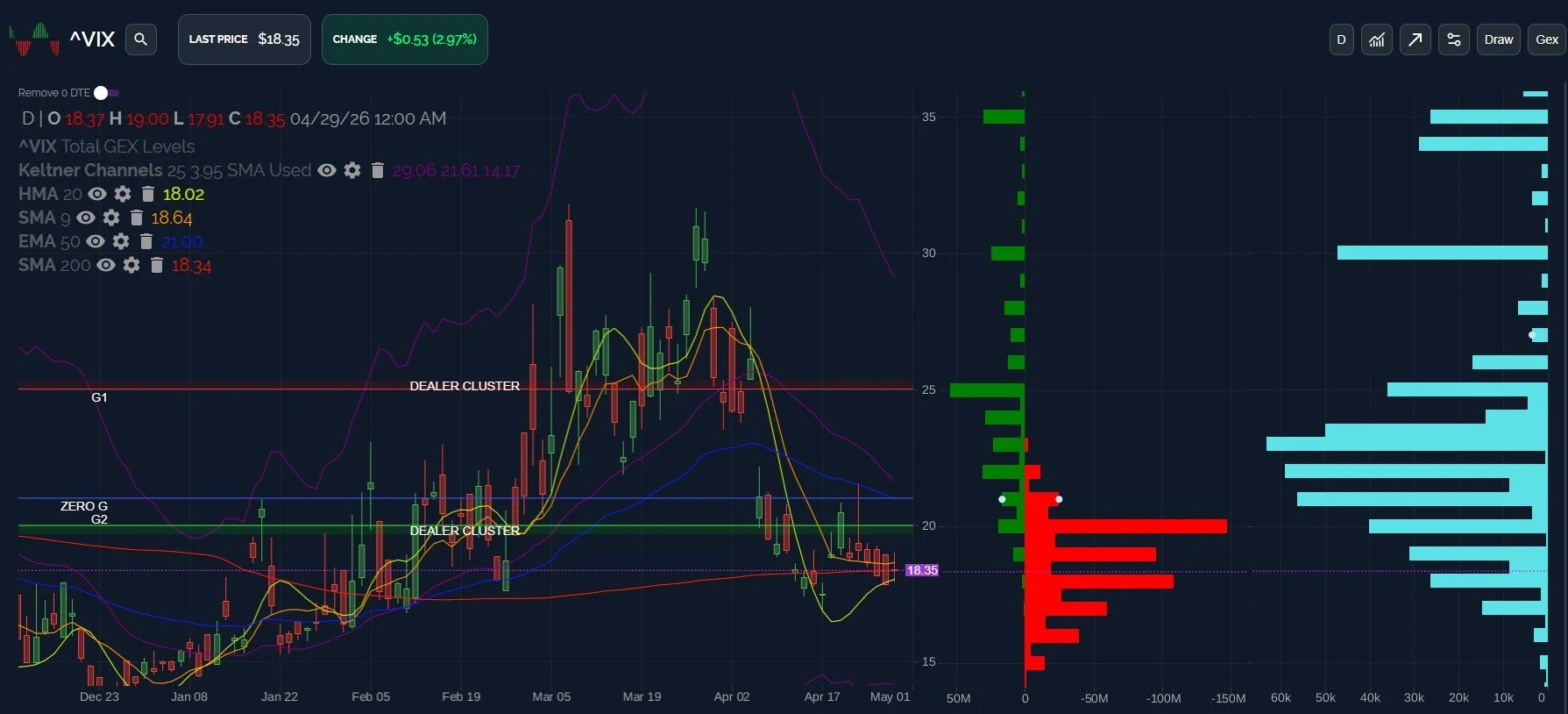 The VIX seems to suggest that even if volatility does get crushed further, the downside is likely limited, with almost no GEX or option volume taking place below the 17 area. Most volume was actually between 20 and 30, and the VIX maintains above the HMA at this moment. All things considered, my opinion is that either the VIX begins a move toward 20, and then potentially 25, or we dip to 17 and likely see a reversal back up from that point.