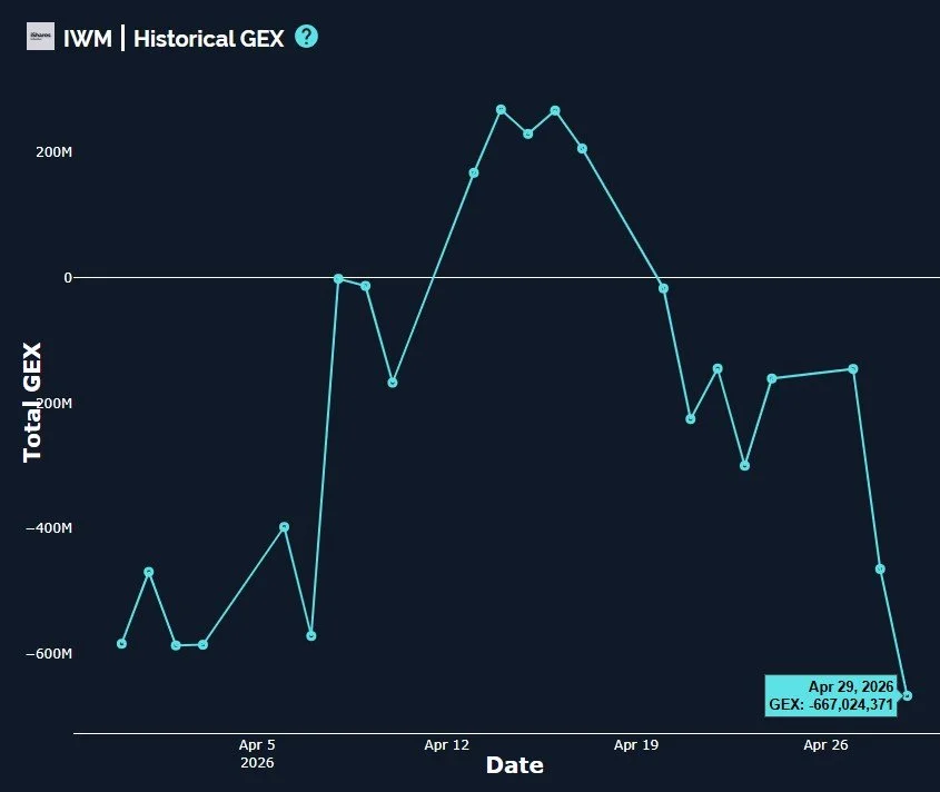 IWM net GEX plunged deep into net negative territory, and in fact, you’ll notice GEX began weakening in advance of the move lower, which is why we like to pay attention to the changes in net GEX.