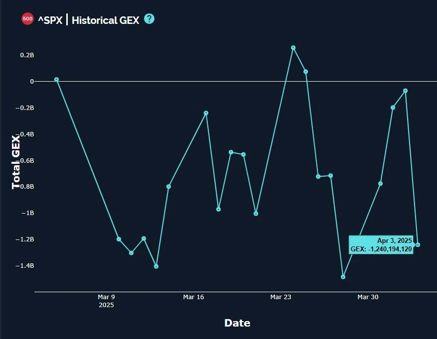 As the graph shows below, SPX dropped from almost tagging the zero GEX line back down to a solid negative position at -1.24B at the close, not at an extreme yet, but still a large change in one day.