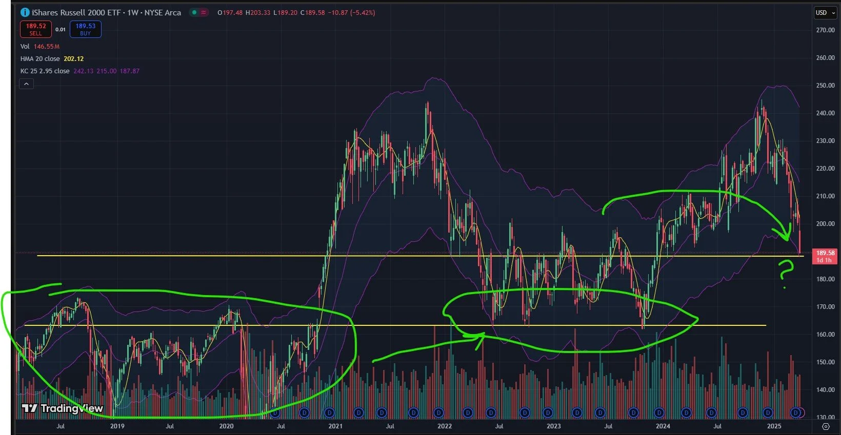 In Discord today, I posted this weekly chart of IWM, essentially showing that the consolidation highs of 2018-2020 became a support level in the 2022-2023 timeframe, and here we are 2 years after that timeframe (some might call it a…"“cycle?”) and we’re faced with the possibility of the 2022-2023 highs becoming support as we end the 1st quarter of 2025 at the same area. We don’t see significant GEX for IWM below 190, but even the best plans can be laid to waste, and I’m prepared to sustain a drop to roughly 180 while still considering this the zone for a rebound. Trade size and allowance of time become important when you’re not trying to be the hero.