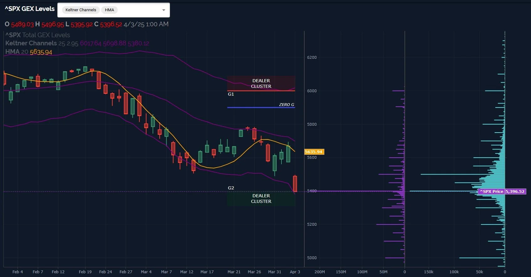SPX closed just below 5400, in the middle of the 5365-5425 range mentioned in the weekend newsletter, so we’re now officially in the lower weekly Keltner channel territory. We also have a lower Dealer Cluster zone coinciding with this theoretical Keltner support that gives us a view of how the option market is positioned, justifying the focus on the lower weekly Keltner. The Dealer Cluster ranges from 5300-5400, where we expect dealers could potentially become buyers.