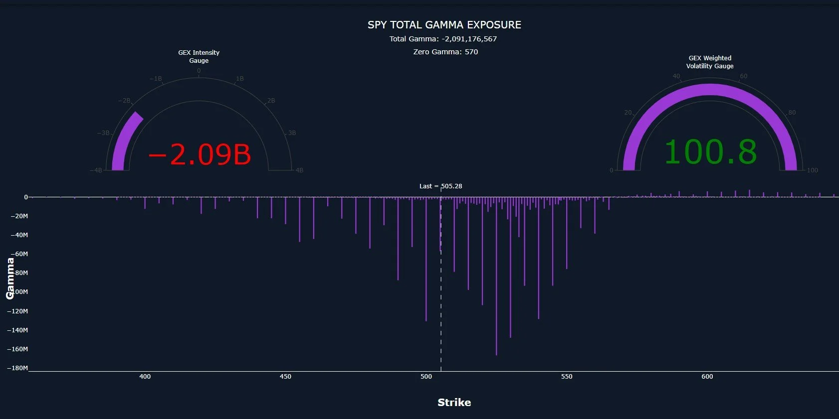 SPY still reflects negative GEX, but note how sharply the negative GEX clusters fall off below 500. 490 has a shot, but there isn’t currently much interest below that level. Meanwhile, lots of GEX remaining on the negative side at higher strikes, with 525 SPY appearing to be a likely target in a squeeze scenario.