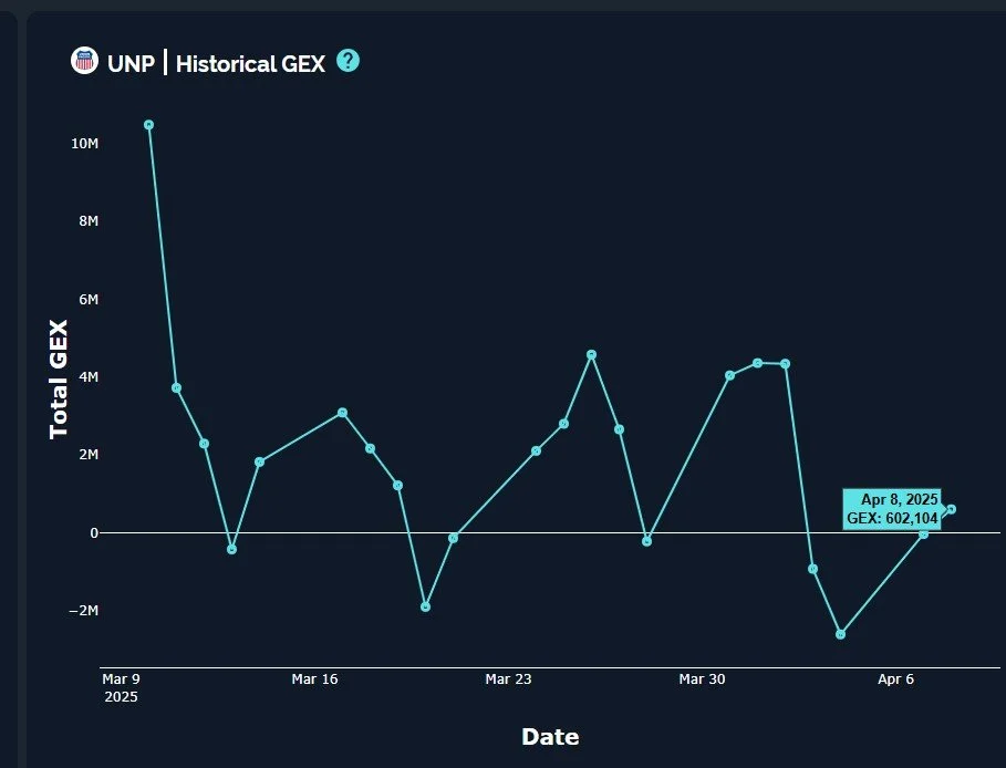 UNP GEX also just went back to positive, so we have a fairly steady GEX picture, even though it doesn’t look super bullish. A rebound is all we need, and GEX seems to suggest UNP has good odds to rebound from this selloff.