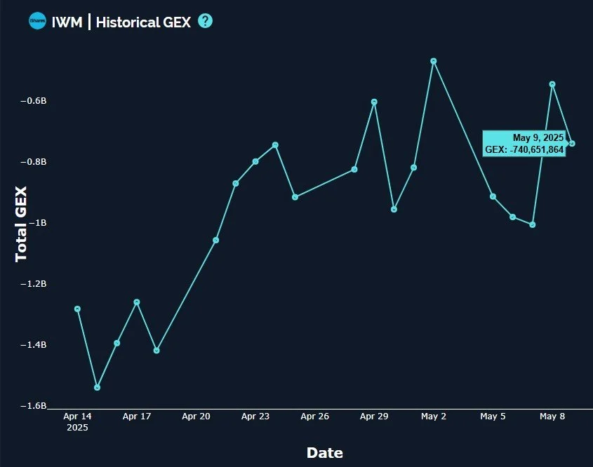 Part of the squeeze scenario with IWM will be seeing a lot of the negative GEX reversing quickly and dramatically, so I would expect the -741M reading from Friday to look very different tomorrow. Could that also mark the reversal point, the “all clear” signal for shorts to actually re-enter? IWM is a tricky animal, so I definitely think there’s a possibility that IWM approaching the positive GEX line could be a good time to hedge again.