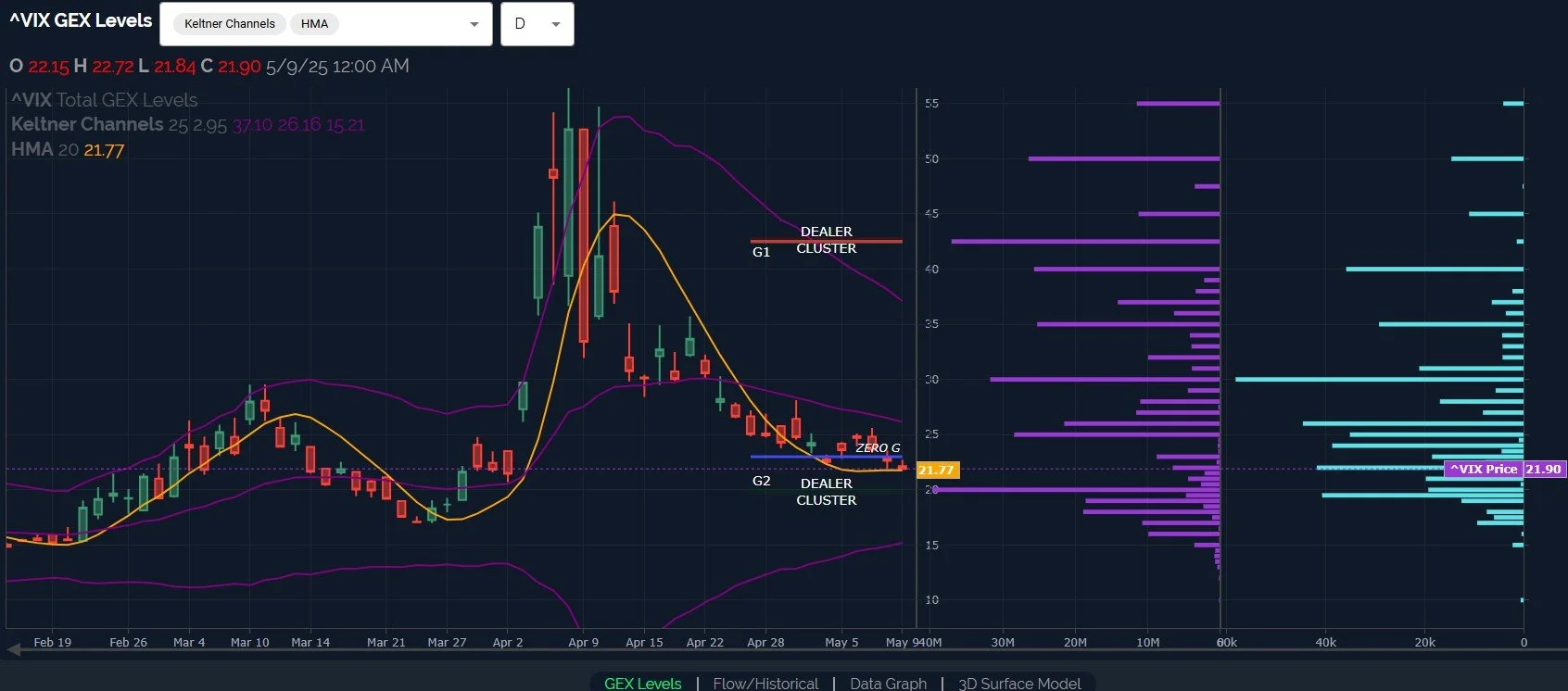 The VIX has shown major GEX at 20 for at least the better part of the last several trading sessions, but it’s really 42.5 on the positive side that has been there even longer, and total net GEX remains positive. We saw the VIX close Friday just above the key Hull, but barring another surprise overnight, we should see the VIX approach 20 and perhaps even overshoot toward the lowest likely targets on the VIX between 18-19. Unless the VIX is headed back to 12-15 immediately, my first thought looking at this is “doesn’t volatility look more like a buy in the lower Dealer Cluster zone?”