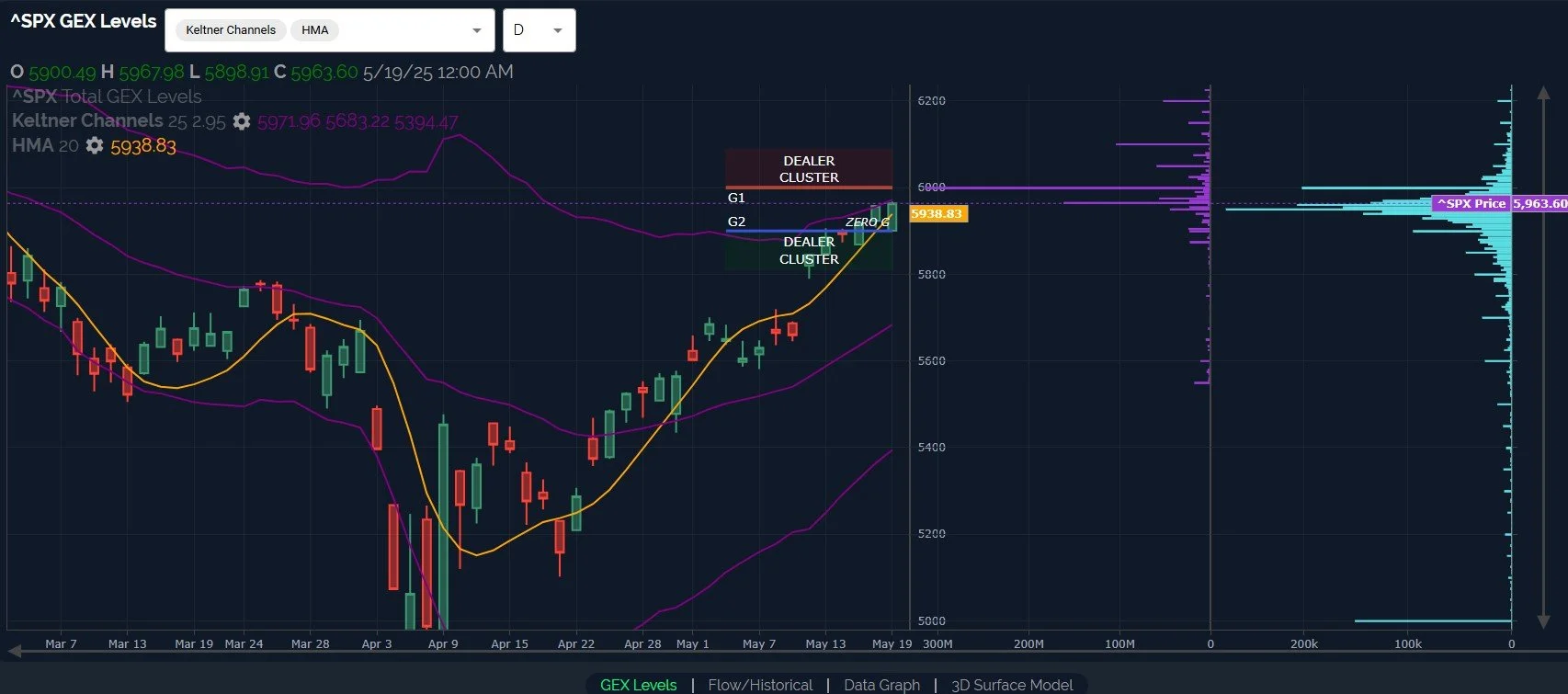 Yet we are pressing up against the upper Keltner channel, a line that apparently matters, given that we can’t stay above it. We also have the big ever-looming GEX cluster at 6000 marking the upper Dealer Cluster zone. The historical graph below shows a slight drop in GEX, still maintaining the bullish 1B+ net GEX reading, yet also reflecting 3 out of the last 4 days showing marginal drops in positive GEX.