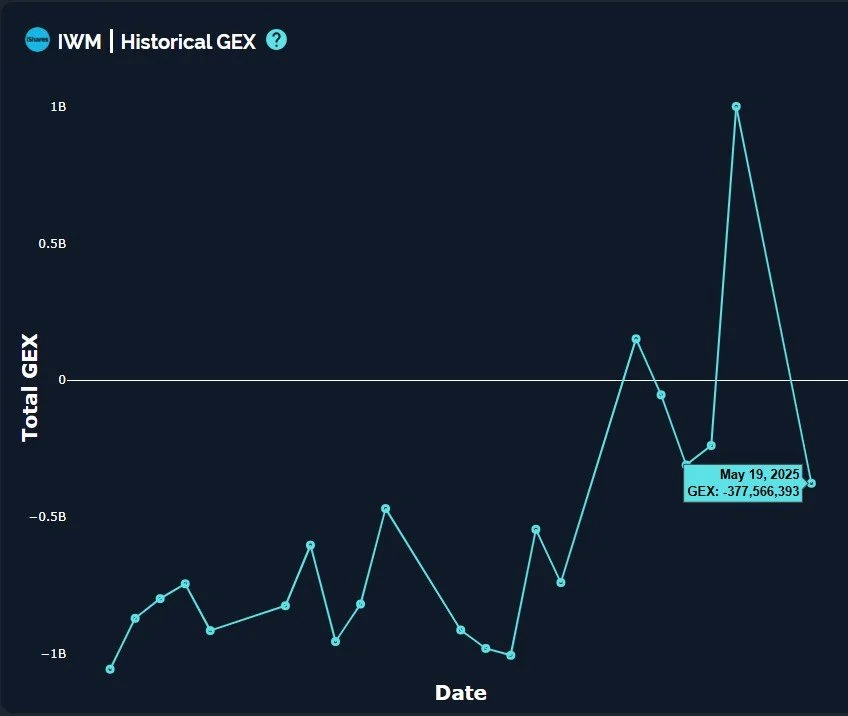 QQQ shows a somewhat more concerning continued drop in total net GEX, only slightly higher than nearly a month ago on April 25.