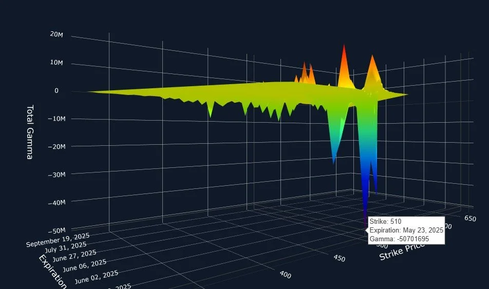 Looking at the 3D graph, 510 appears as the largest negative strike expiring tomorrow, so perhaps we will find our way toward that strike. If we approach 510 early enough, that general area may end up being a buy, similar to 5800 SPX.