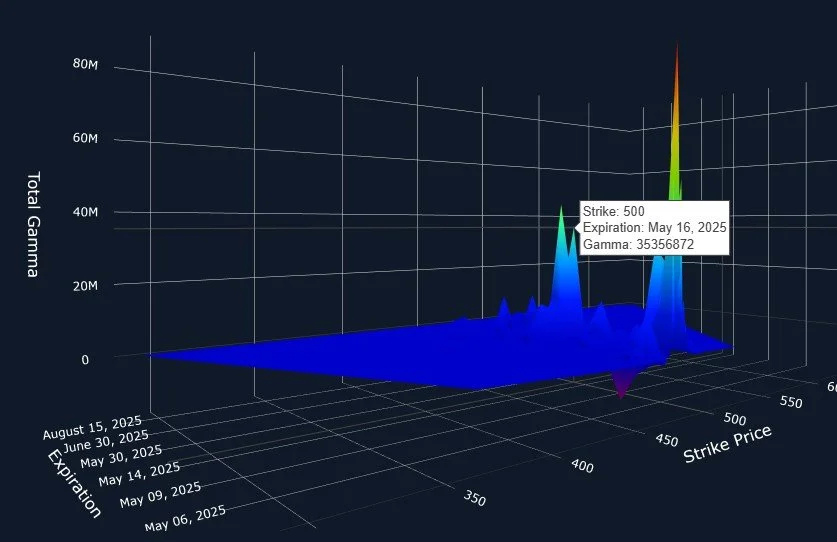 QQQ has some notable and potentially informative GEX clusters as we look at the 3D graph, with 490 and 500 both being very concentrated at the 5/16 OpEx date. Might we see a pullback over the next few days, then a move higher into mid-May? Oh, we might. At least today’s positioning makes sense to keep that as a possibility with good odds of happening..We’ll continue to watch for further changes.