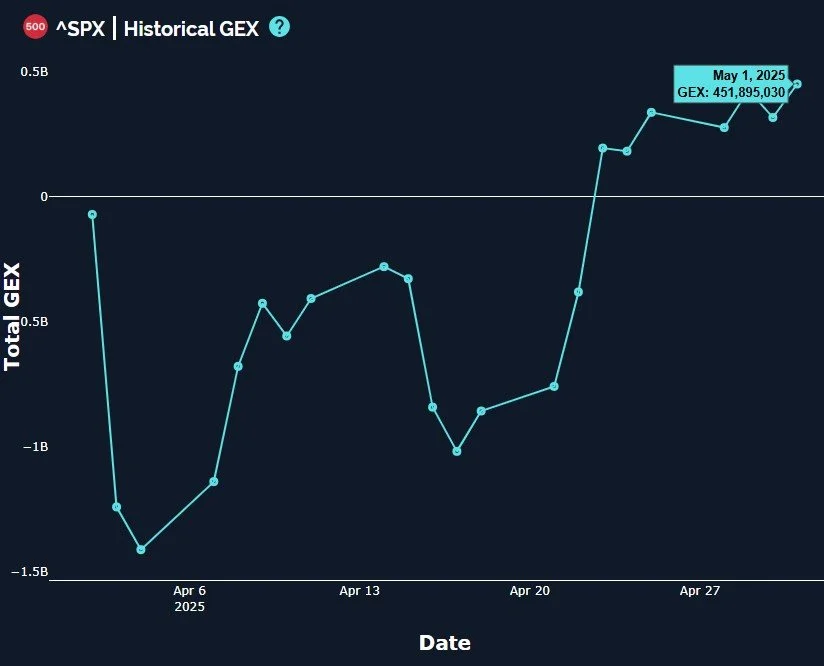 The VIX is another potentially confirming index for the idea of a pullback and then a move higher: The GEX at the 20-strike is large, and most of it is focused on the May VIX expiration, the Wednesday following OpEx Friday this month (5/21). In the meantime, we see large GEX at higher strikes, including a variety of strikes between 30-50, and we see volume at those higher strikes, especially 32 today. We just closed for the 2nd day above the Hull, so I am on immediate watch for a larger VIX spike. If the indices maintain their GEX picture in general as we embark on such a pullback, we may have a good dip buy just ahead.