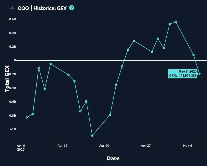 QQQ dipped back into negative GEX territory, dropping back to late April levels in slightly more dramatic fashion than the shift we’ve seen in SPX. You can see that GEX doesn’t move in a straight line, but I think we have enough of a multi-day drop in GEX to warrant caution and consideration that GEX may be signaling a small red flag that the market may be ready to see a larger pullback.
