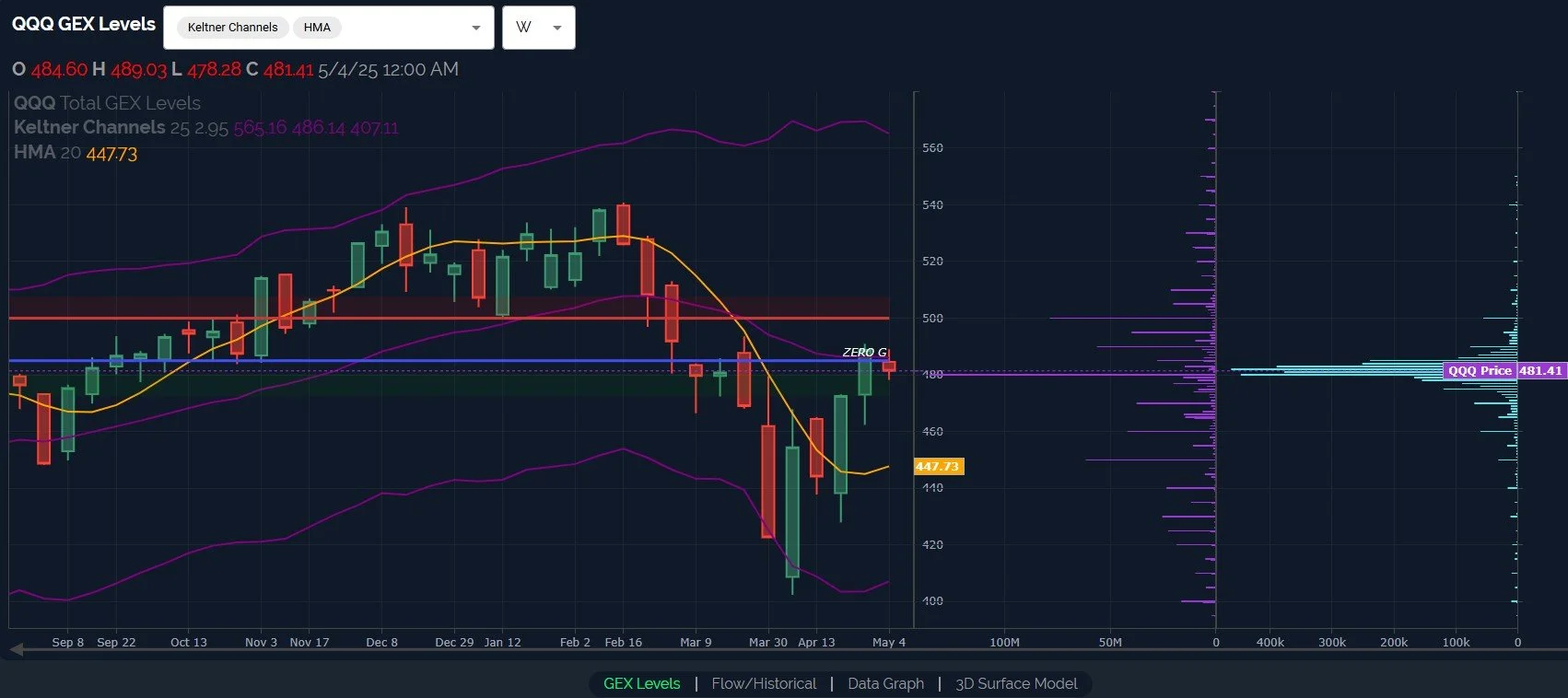 Looking at QQQ, which has the same dynamics impacting the confluence of its daily and weekly charts, we still see meaningful GEX at the 500 strike above, and the largest cluster at 480 marking the importance of today’s close. The weekly chart better matches the GEX picture, with the next largest GEX cluster at 450 getting very close to the weekly Hull at 447.73. I know, 32 points is a big drop for QQQ, but as the optimist in the room, I have to focus on the benefit of saving up for the shopping spree that I know might lay ahead. There’s an old saying- “stocks are the only assets that people love to buy at higher prices instead of at lower prices,” to paraphrase. Well, I like an old-fashioned going out of business sale, what can I say.
